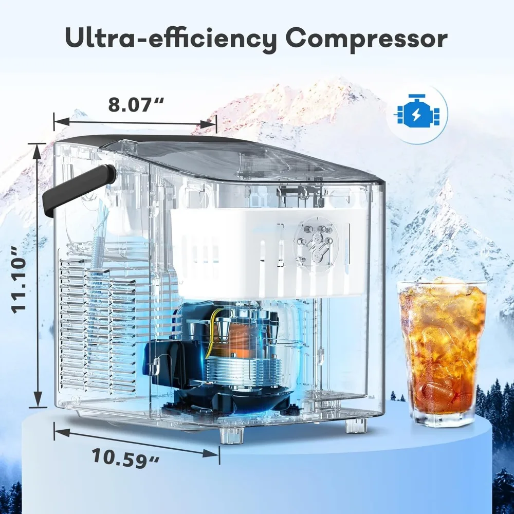 - [Efficient Compressor & Low Noise] Countertop ice maker is equipped with a new generation of efficient compressors, achieving low noise while achieving fast ice making. The ice making process will not affect your daily work, learning, and entertainment.