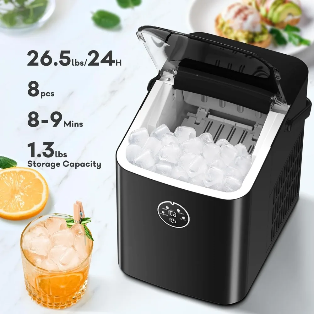 - [Fast & Intelligent Ice Maker] Countertop ice maker can produce up to 8 ice cubes in 9 mins, producing 26.5 pounds of ice per day. Although we have limited the size of the ice maker, we have also kept the ice making speed and ice volume to the maximum extent possible.(Note: If you do not use the ice immediately, transfer the ice cubes to the refrigerator.The ice maker does not have the function of storing ice cubes for a long time.)
