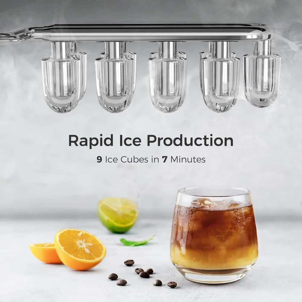 - 【Efficient Ice Making】Equipped with a high-quality R600a compressor, this tabletop ice maker can produce approximately 9 ice cubes in 6-8 minutes and up to 26 lbs of ice cubes in 24 hours. You can get fresh ice whenever you want with this low-noise countertop ice maker.