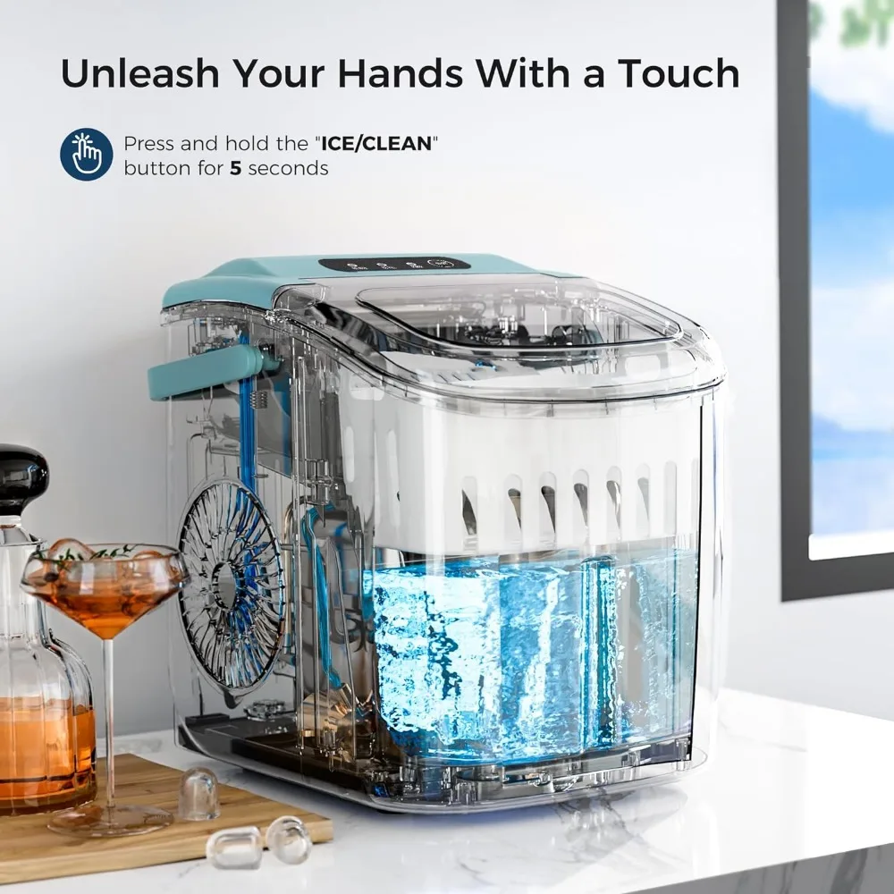 - 【Multiple Smart Functions & Easy Operation】Our ice maker indicators will remind you to take out the ice cubes when the basket is full and will alert you to add water when the ice maker is low on water. Simple and clear control panel is user-friendly enough for you to operate. The transparent viewing window lets you monitor the ice-making process, and the removable ice basket and ice scoop make removing ice a breeze.