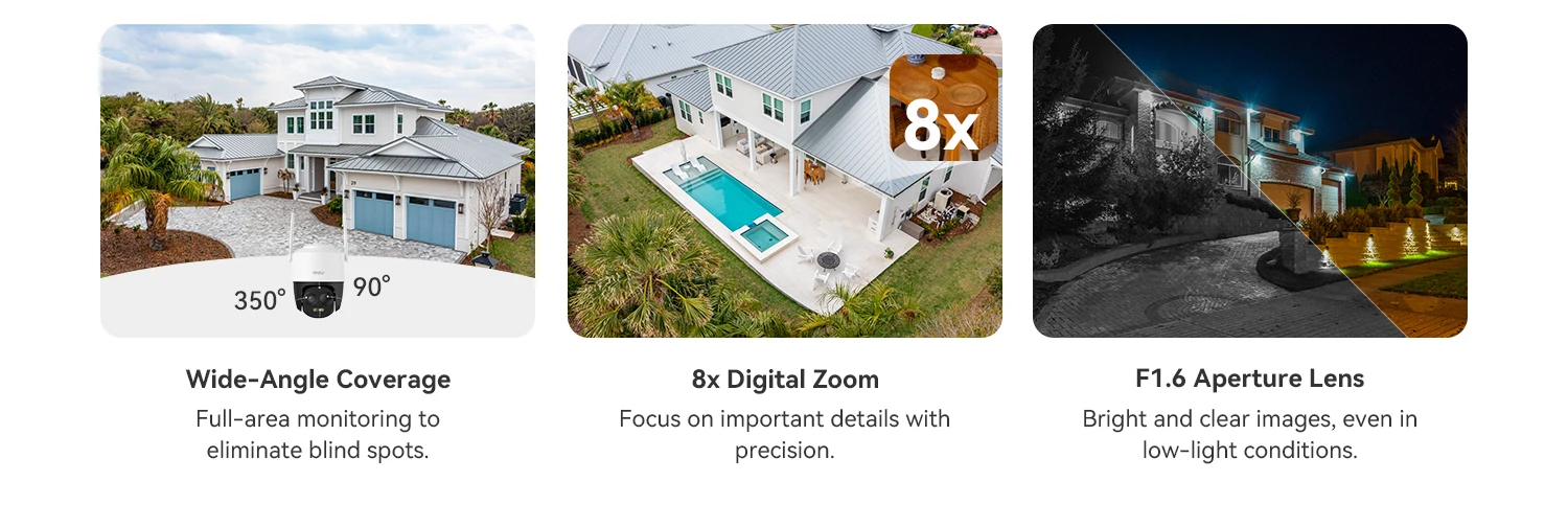 With its wide-range pan and tilt, this camera covers every angle of your outdoor space. Effortlessly zoom in to capture details like visitors or movement, while enjoying sharp, clear images even in low-light conditions.