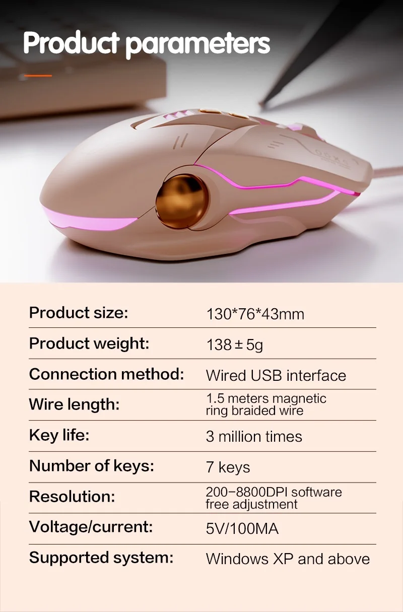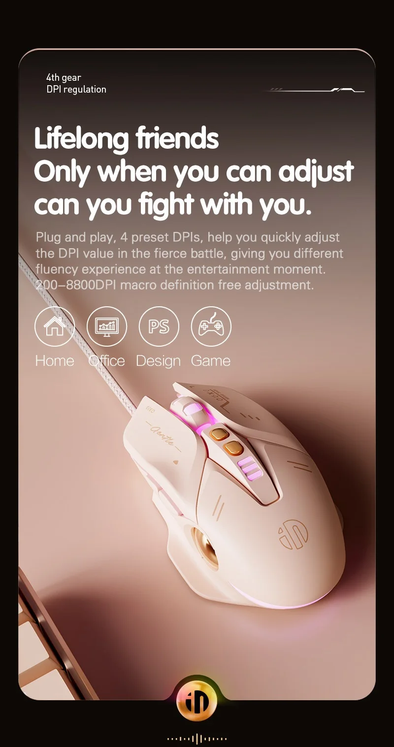 Plug and play, 4 preset DPIs, help you quickly adjust the DPI value in the fierce battle, giving you different fluency experience at the entertainment moment. 200-8800DPI macro definition free adjustment