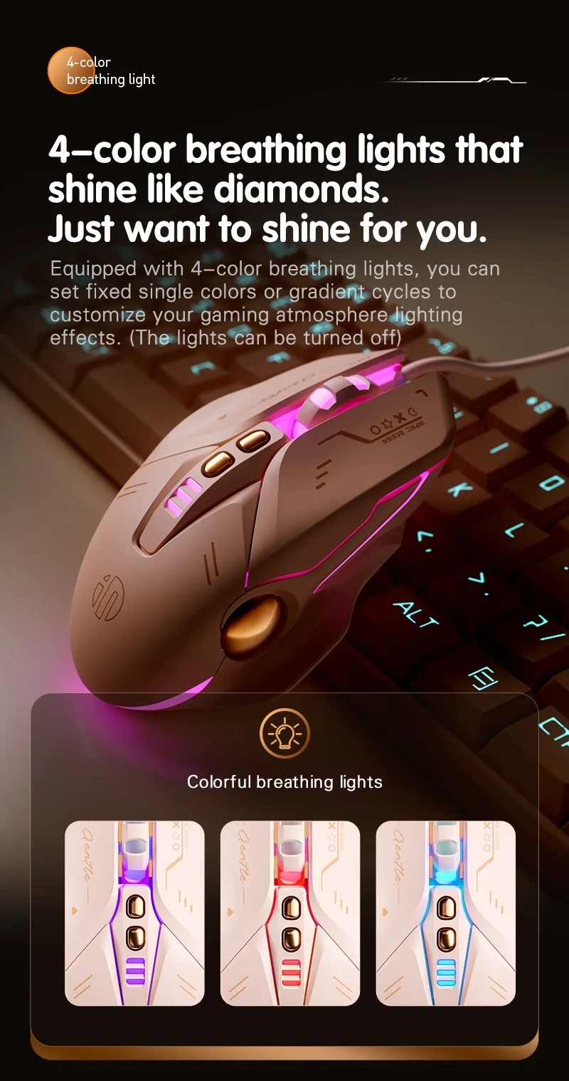 Equipped with 4-color breathing lights, you can set fixed single colors or gradient cycles to customize your gaming atmosphere lighting effects. (The lights can be turned off)