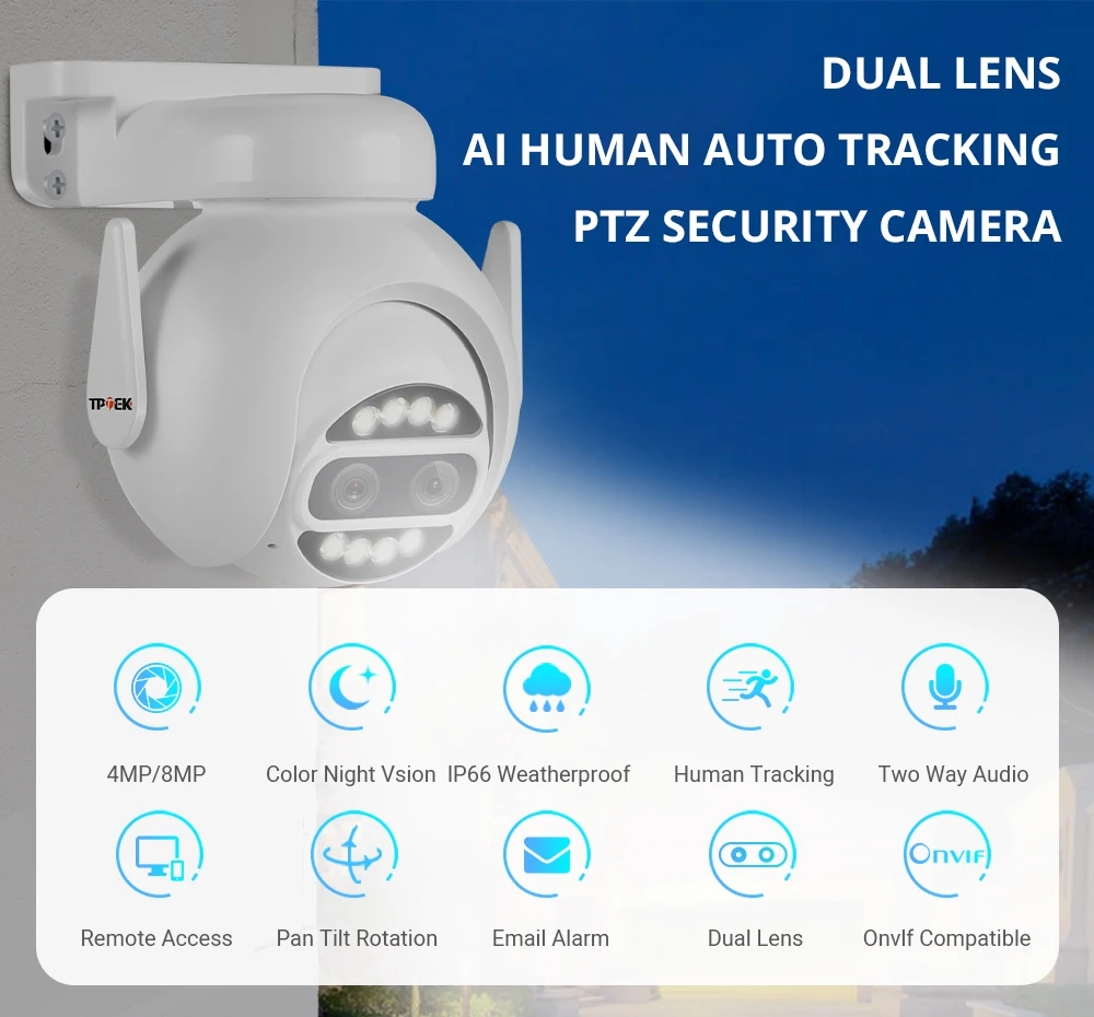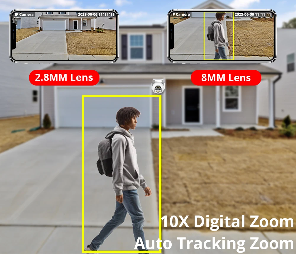 AI Human Tracking With Auto ZoomThe camera will adjust the pan/tilt rotation and zoom automatically,capturing clear monitoring targets and auto-tracking moving human,and push alerts via email or notifications to your phone.