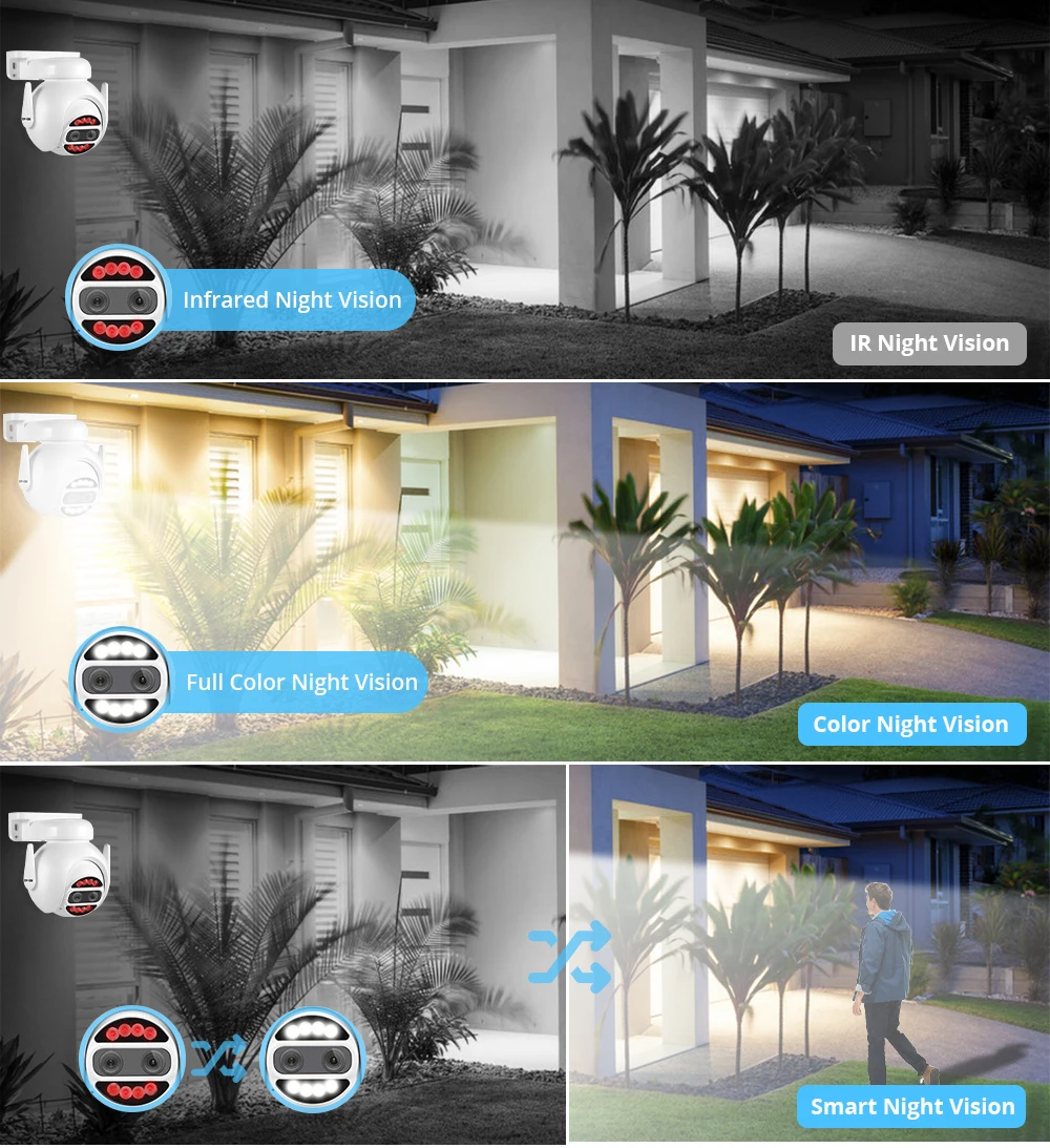 Double Warning for the UnwelcomeOnce an intruder is detected, the camera’s spotlights and siren will be triggered or manually activated to warn off the would-be criminal. Stop the crime before it happens.No human movement can slip through without your notice. Receive instant app