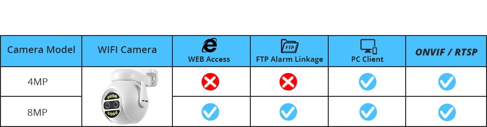 “4MP” don’t support web access, don’t support ftp alarm linkage, if you need to access your camera via web and ftp function please ”8MP“ wifi camera.