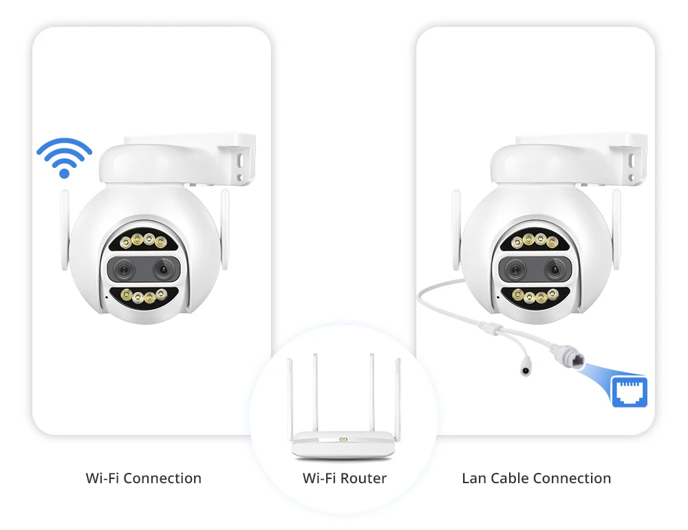Plug and playSupports 2.4 Ghz WiFi and LAN network connection,no matter where you are,you can remotely access the camera to see live streaming and stay connected.