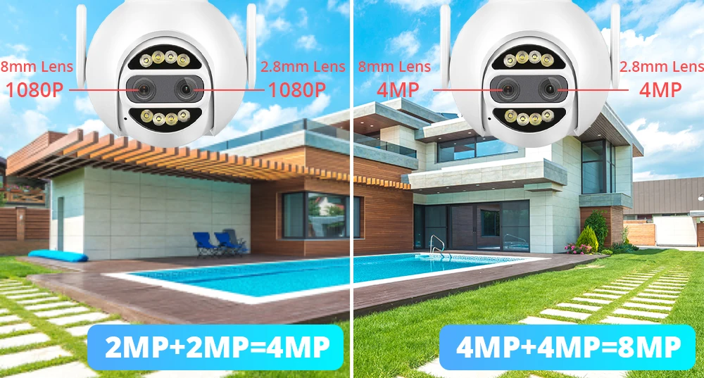 Purchase Option”4MP” means one 2MP resolution camera is installed with 2 lenses, one is 1080P 2.8mm lens, the other is 1080P 8mm lens.“8MP” means one 4MP resolution camera is installed with 2 lenses, one is 4MP 2.8mm lens, the other is 4MP 8mm lens.