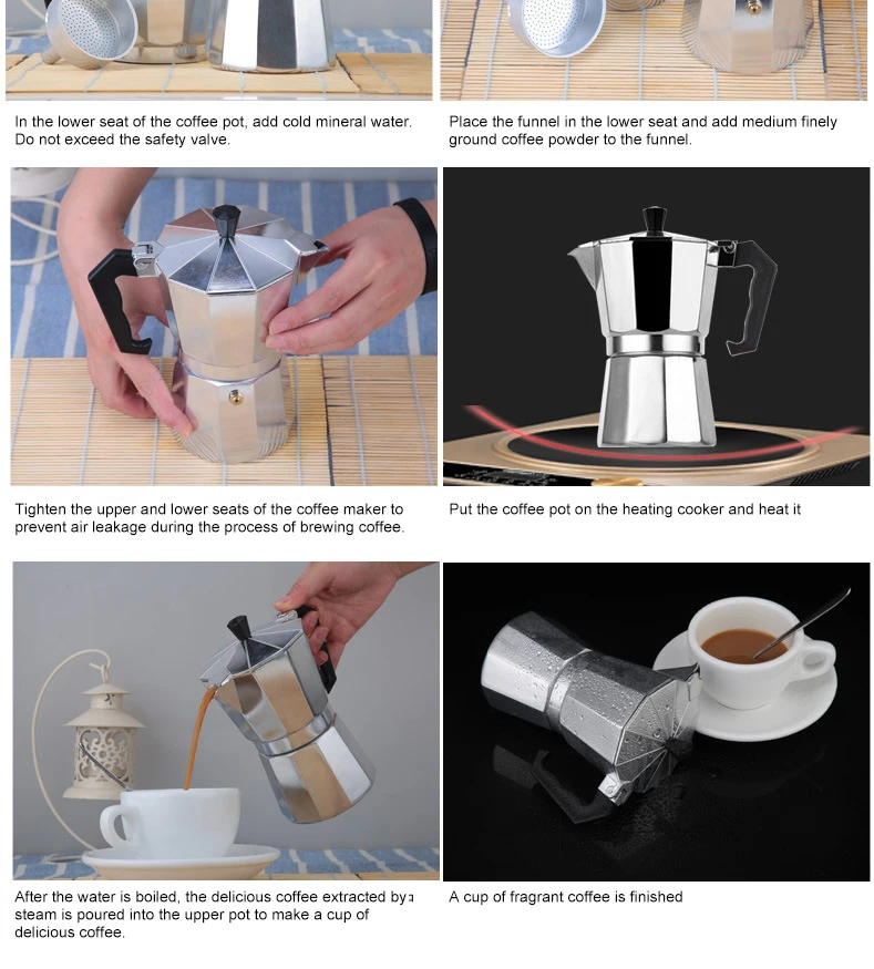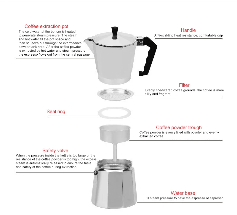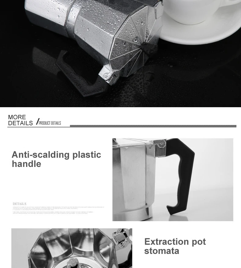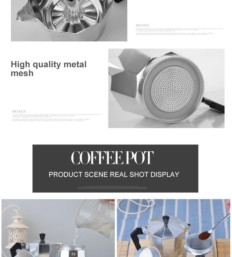 • Aluminum Mocha Espresso Percolator Pot :Made of high-quality aluminum, this coffee maker is durable and long-lasting.