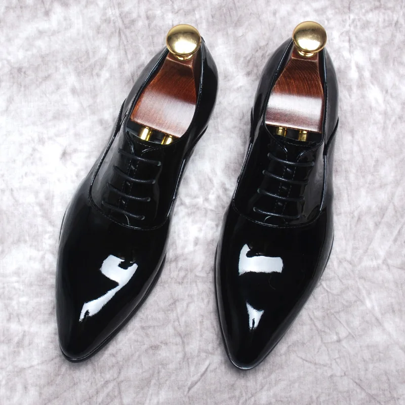 Italy Pointed Toe Oxford Men Shoes Genuine Leather Fashion Patent Leather Pointed To Lace Up Formal Business Dress Shoes Wedding