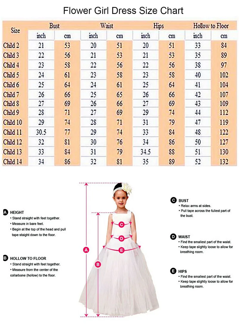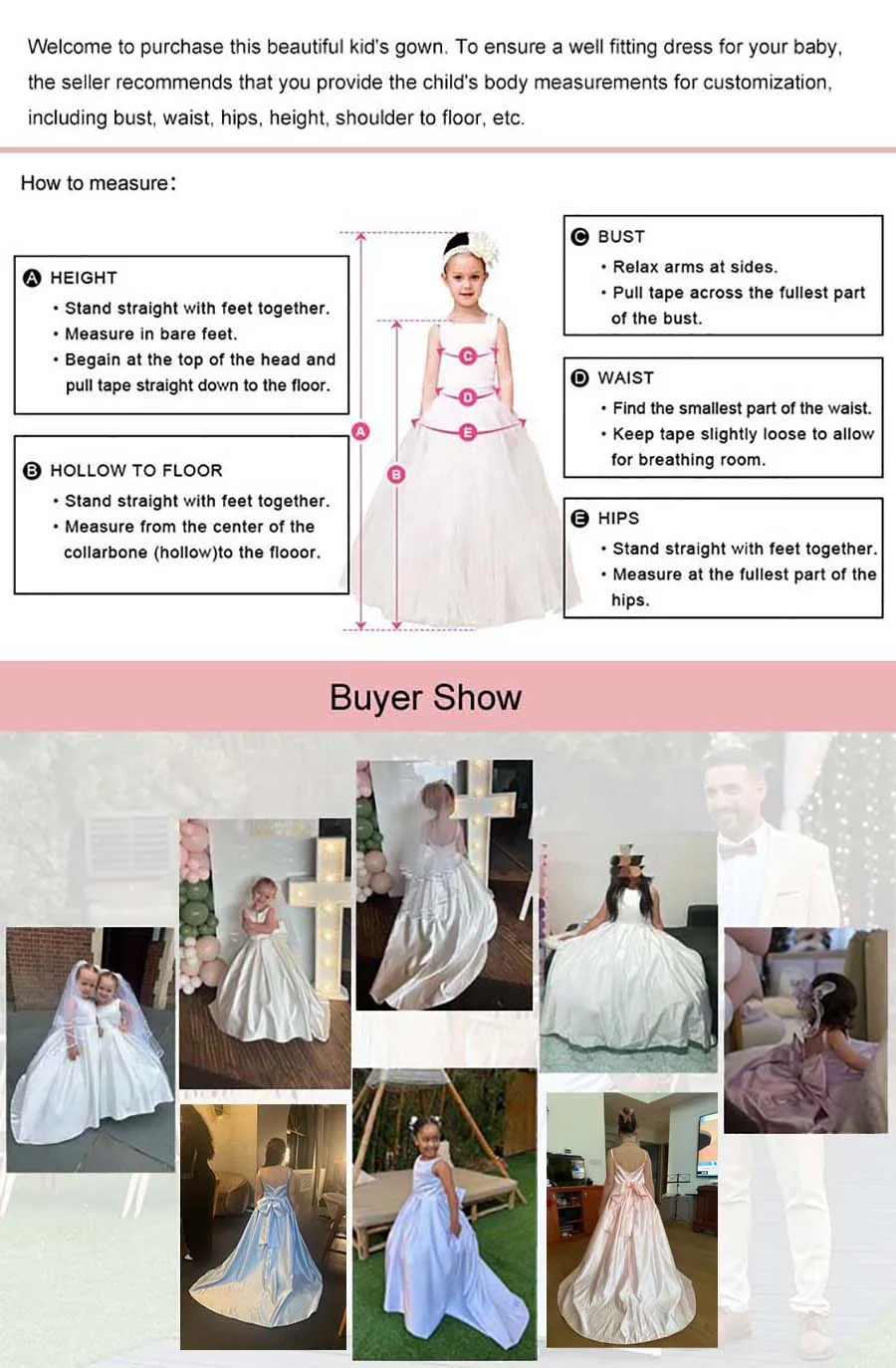 Before placing an order, please carefully measure your child’s body measurements, including bust, waist, hip, hollow to floor, height, and so on.