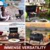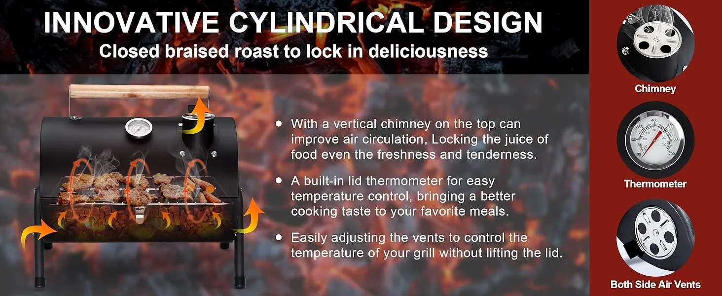 - 【PRECISION HEAT CONTROL】 A built-in lid thermometer for easy temperature control, Monitor the temperature in real time, No longer afraid of burning, Precisely control the internal temperature by adjusting the vents on each side of the grill without lifting the lid, A vertical chimney create a three-dimensional heating environment, Locking the juice of food even the freshness and tenderness