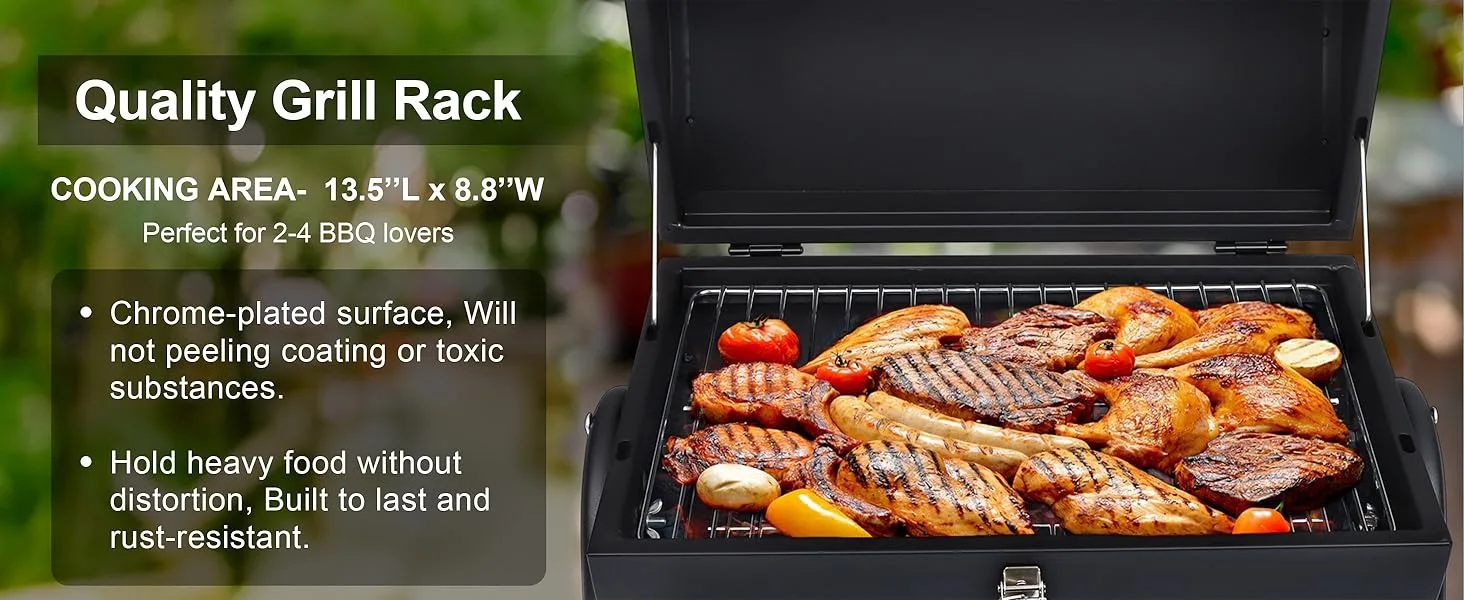 - 【GRILL RACK】 Cooking area 13.5”x8.8”, A good choice for 2-4 people grilling, Perfect to cooking burger patties, bacon, steaks, sausages, kebab, Stainless steel grilling rack with chrome plating does not release any harmful substance, Not easy to stick food and easy to clean, Thicker outer ring for better stuck in the groove to avoid slipping, Support heavy food with ease