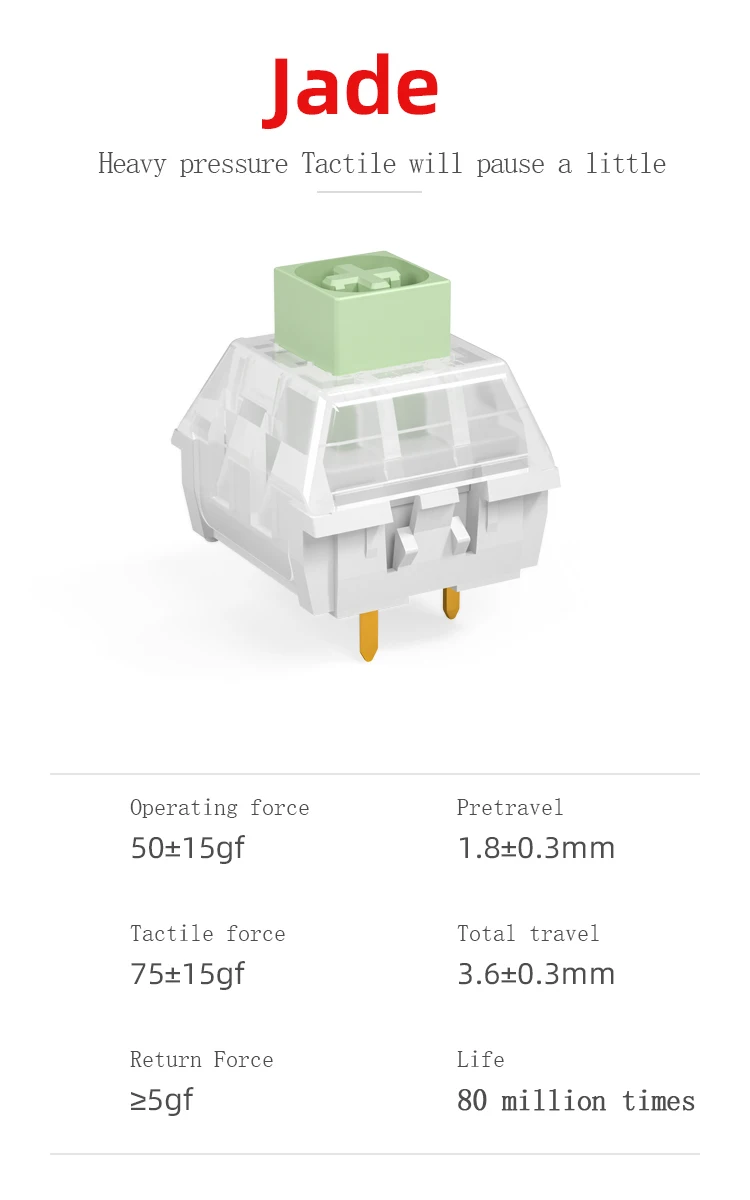 I am extremely satisfied with the product. I love the clicky sound of the switch! If you are planning to type for long hours, you might need to consider other Kailh switches as the Kailh Box Jade requires some force to press. However, I still love using it! But the delivery package should be better as some of the pins of the switches were bent!