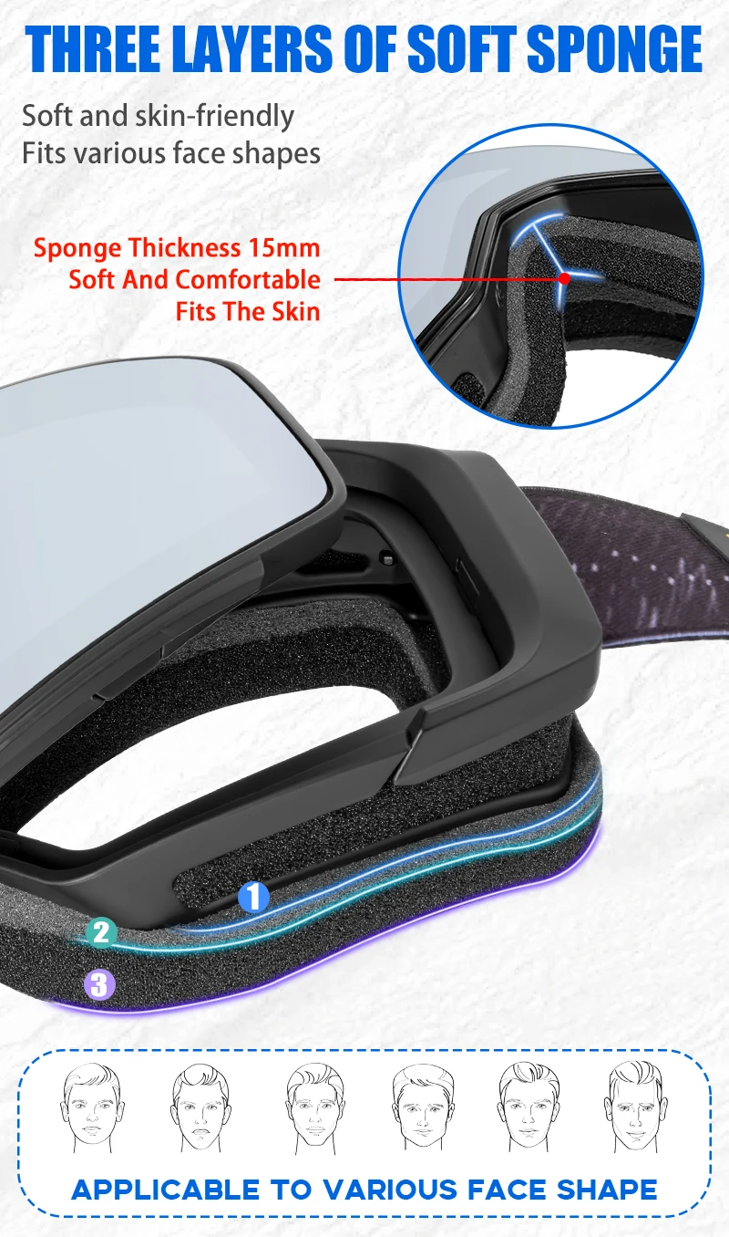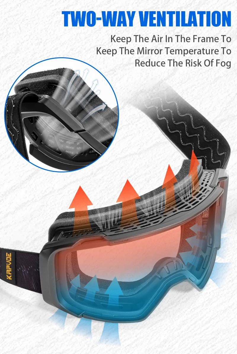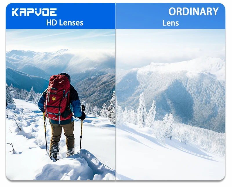 Due to the strong sunlight, reflected light from snow mountain and cold wind that stimulate the eyes, we suggest you choose a security professional ski goggles while the brand “KAPVOE” is your best choice. KAPVOE ski goggle is more fit for your face and can prevent your eyes from the heavy wind. The lens is made from imported material and its comprehensive REVO mirrored coating is hardened, scratch-resistant and abrasion-proof for warious weather condition. The goggles are Anti-UV, play a key role in eyes protection.