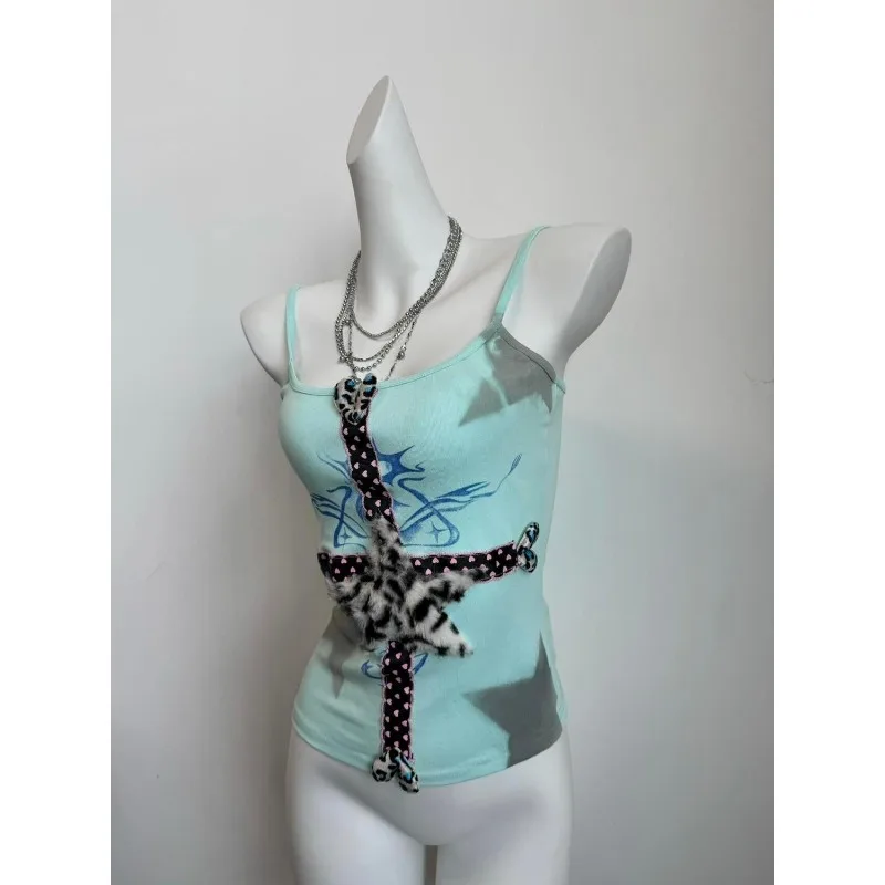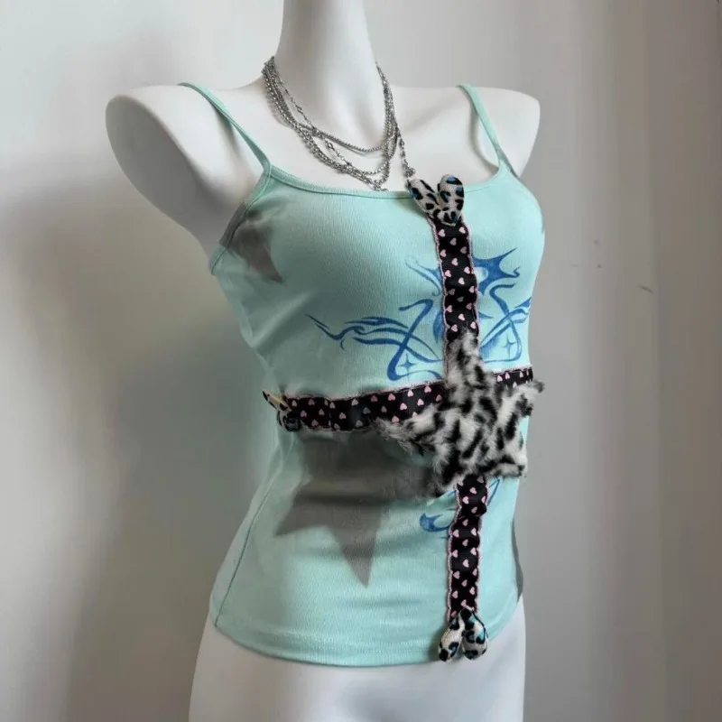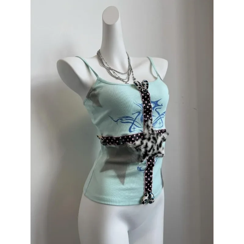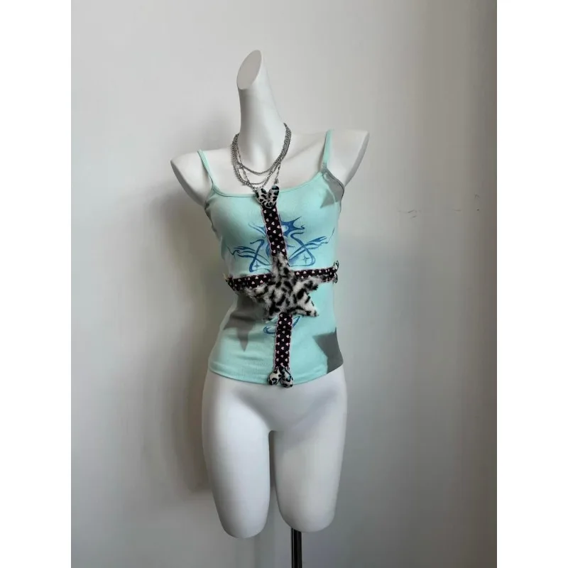 Kawaii American hot girl Mint green leopard cross star pattern love print suspender T-shirt for women summer sleeveless slim top