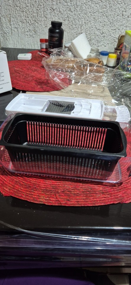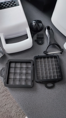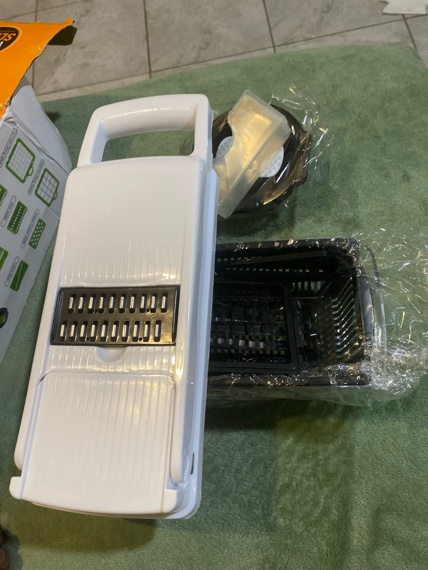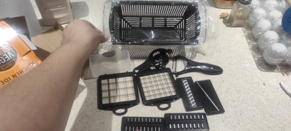 I liked it, it comes with all the pieces you mention... The only thing that I did not like so much was that the large tray with the part where the cutters go does not quite fit together, which encourages you to move when using. Arrived before the date marked that November 2-9 would arrive and October 30 arrived.