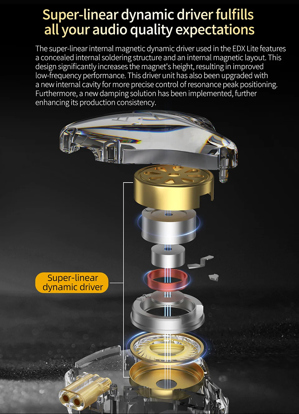 The super-linear internal magnetic dynamic driver used in the EDX Lite features a concealed internal soldering structure and an internal magnetic layout. This design significantly increases the magnet’s height, resulting in improved low-frequency performance. Thisdriver unit has also been upgraded with a new internal cavity for more precise control of resonance peak positioning. Furthermore, a new damping solution has been implemented, further enhancing its production consistency.