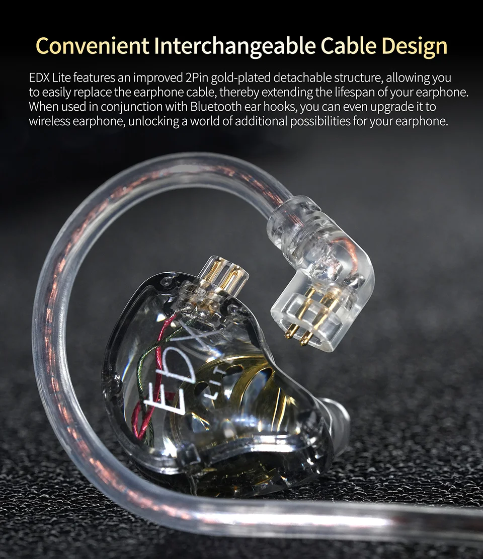 EDX Lite features an improved 2Pin gold-plated detachable structure, allowing you to easily replace the earphone cable, thereby extending the lifespan of your earphone. When used in conjunction with Bluetooth ear hooks, you can even upgrade itto wireless earphone, unlocking a world of additional possibilities for your earphone.