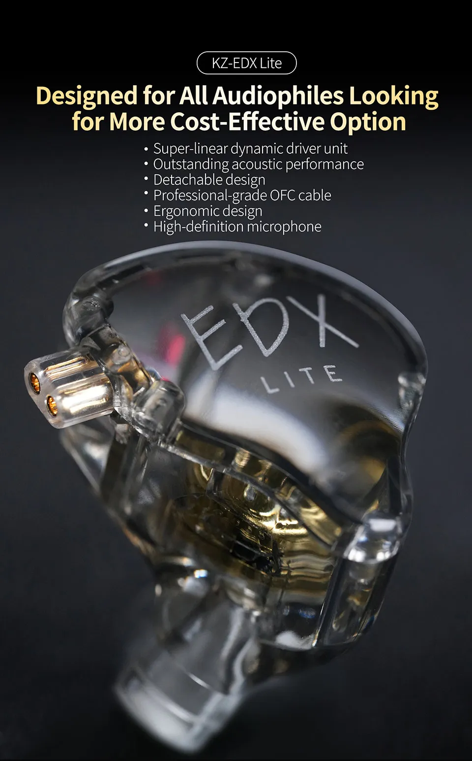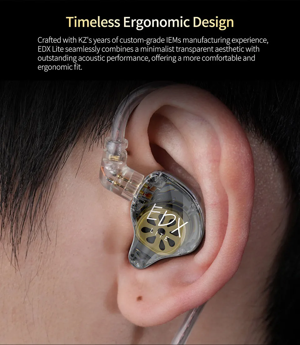 Crafted with KZ’s years of custom-grade IEMsmanufacturing experience,EDX Liteseamlessly combines a minimalist transparent aesthetic with outstanding acoustic performance, offering a more comfortable and ergonomic fit.