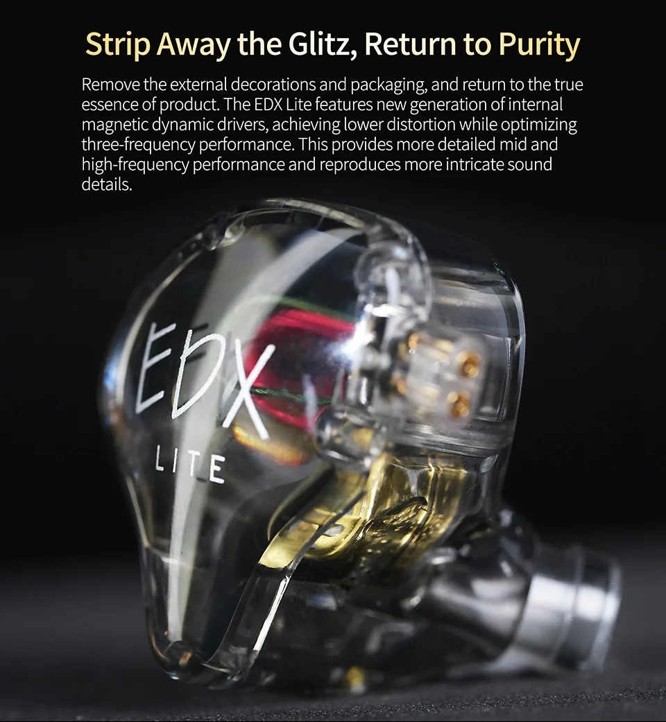Remove the external decorations and packaging, and return to the true essence of product. The EDX Lite features new generation of internal magnetic dynamic drivers, achieving lower distortion while optimizing three-frequency performance. This provides more detailed mid and high-frequency performance and reproduces more intricate sound details.