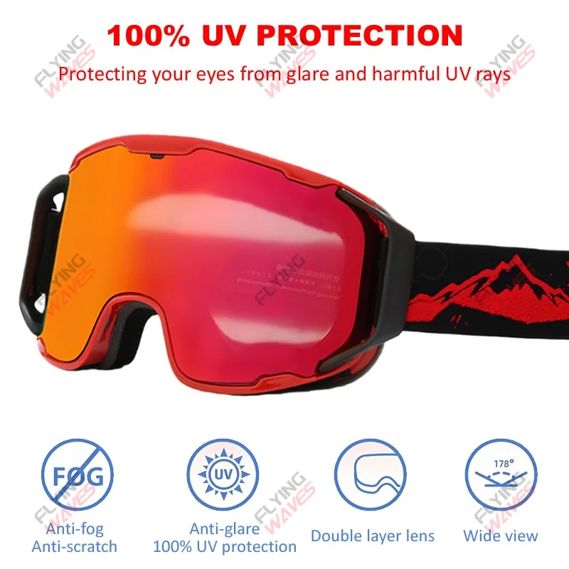 【Anti-fog & 100% UV Protection】Advanced double-layer lens, the inner lens with long-lasting antifog materials and high performance hydrophilic coating, professional ventilation system can reduce fogging and optimize the flowing air over the inside of the lens. The outer lens with super-hardening technology can improve anti-scratch performance. These adult ski goggles for all snow sports ski, snowboard, snowmobile and etc