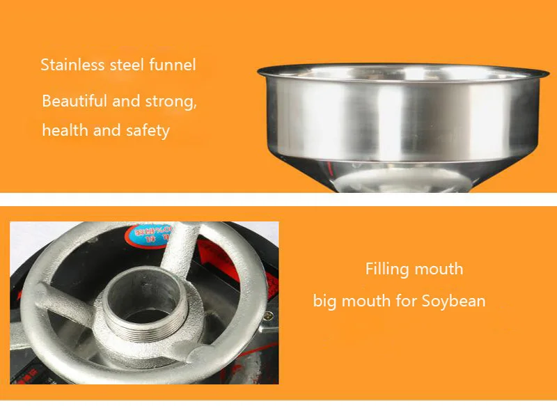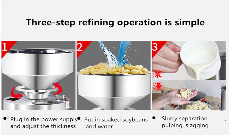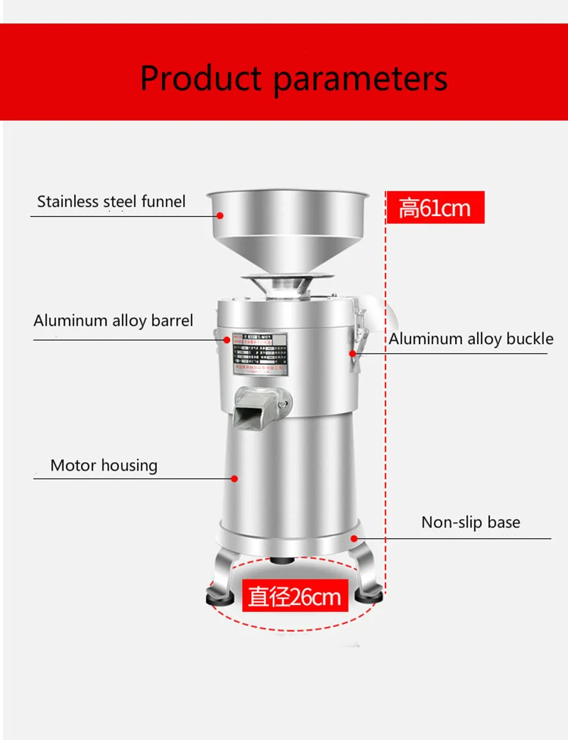 Product model: Type 100 refiner Filter: 100 mesh Product weight: about 16kg Material: stainless steel + aluminum polishing Motor power: 750w Wheel diameter: 100mm Motor speed: 2800 rpm Machine size: 22*22*61CM Product function: soy milk, tofu, bean dregs, etc.