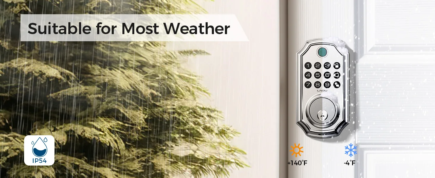 This LNDU smart door lock is engineered to brave the elements. It shrugs off rain and splashes, while its robust build endures extreme temperatures, from a scorching to a frigid. No matter the weather, count on it for unwavering security and performance.