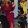 Women Sexy Deep V Sequins Wrap Ruched Long Sleeve Formal Dress Nightclub Dress