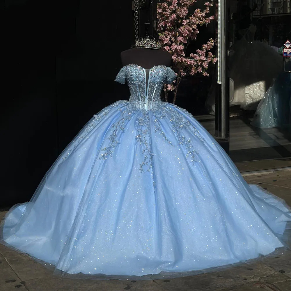 Luxury Beaded Blue Ball Gown Mexican Quinceanera Dress 2024 Princess Prom Sweet 16 Dress Vestidos De XV Birthday Pageant Dress