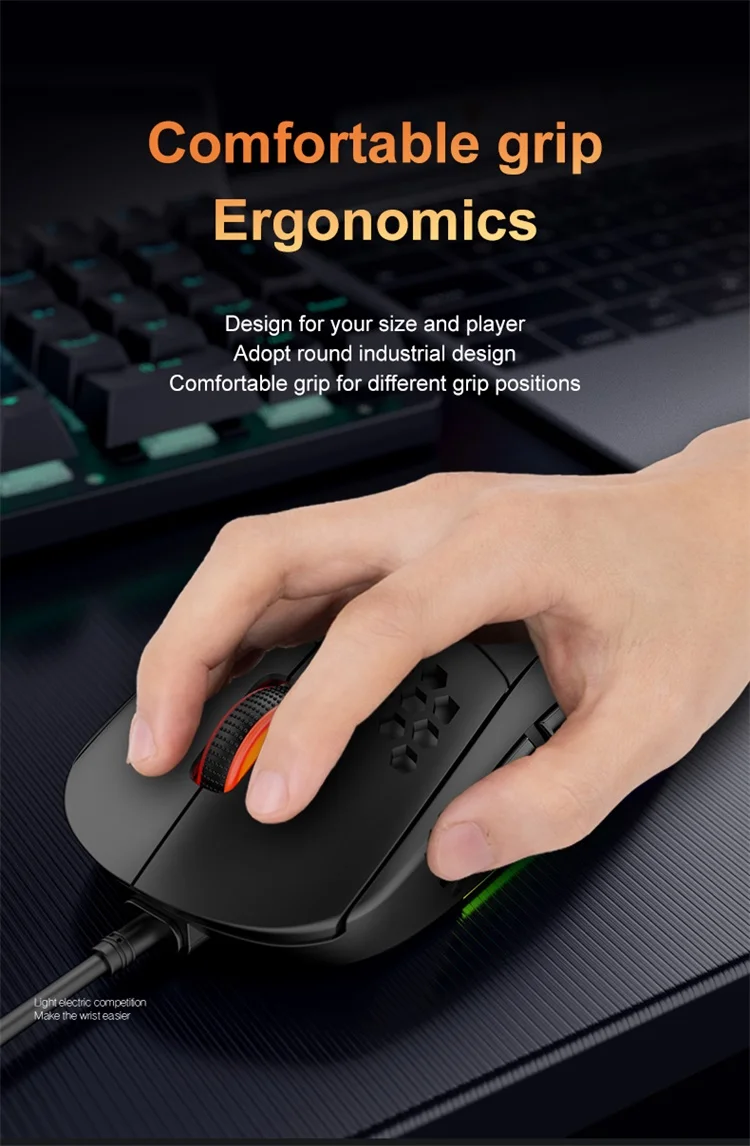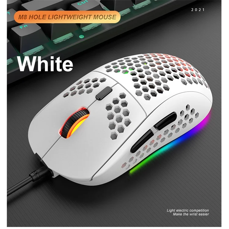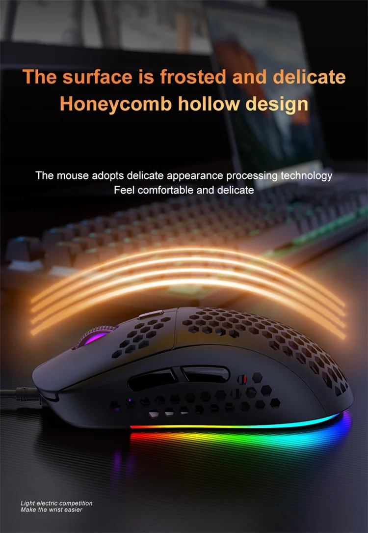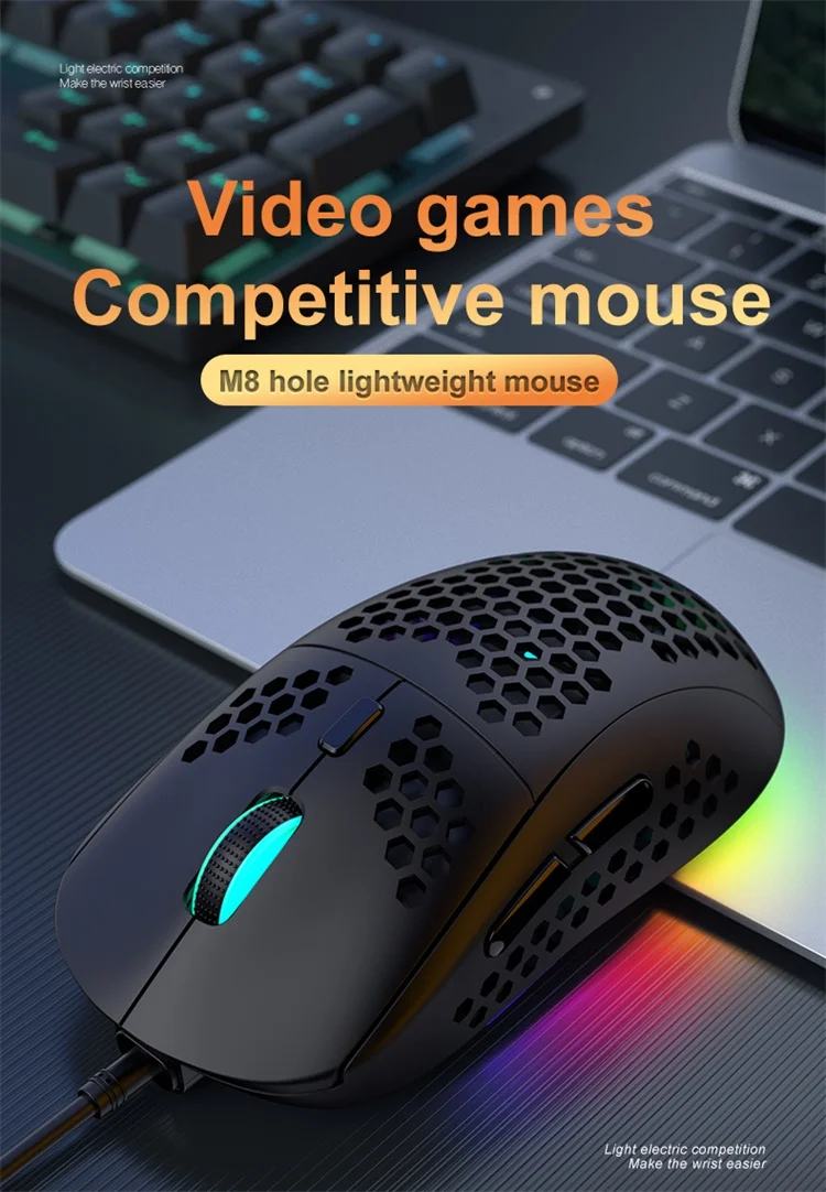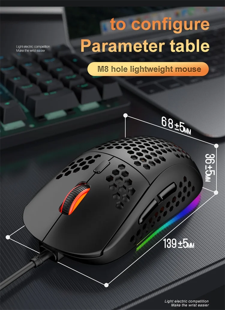 • Ultralight Honeycomb Design :The M8 gaming mouse features an ultra-light honeycomb shell, making it comfortable for long gaming sessions and easy to maneuver.