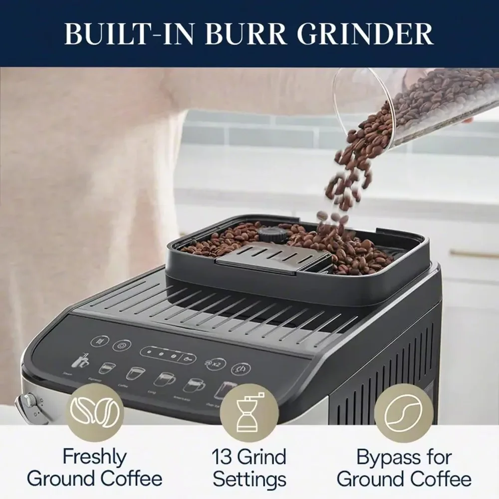- PERFECT GRINDING: 13 grind settings means all of your bean varieties are optimally prepared for extraction. The conical burr grinder delivers a precise, consistent dose of freshly ground coffee for all your favorite espresso beverages.