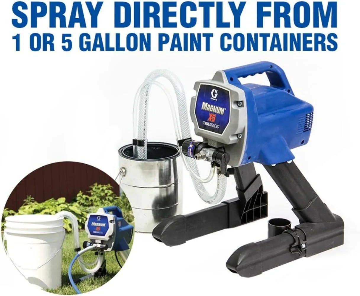 - Flexible suction tube allows you to spray directly from a 1 or 5-gallon paint bucket (Graco Magnum X5 Stand Airless Paint Sprayer).