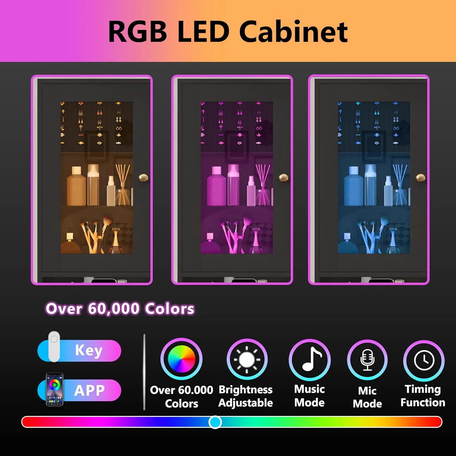 【RGB Cabinet Lighting & Jewelry Display Shelf】Set the mood with built-in RGB lights, controlled via app or switch. The top shelf includes a recessed jewelry organizer, perfect for displaying earrings and accessories in an elegant, dust-free way. A stylish combination of aesthetics and functionality