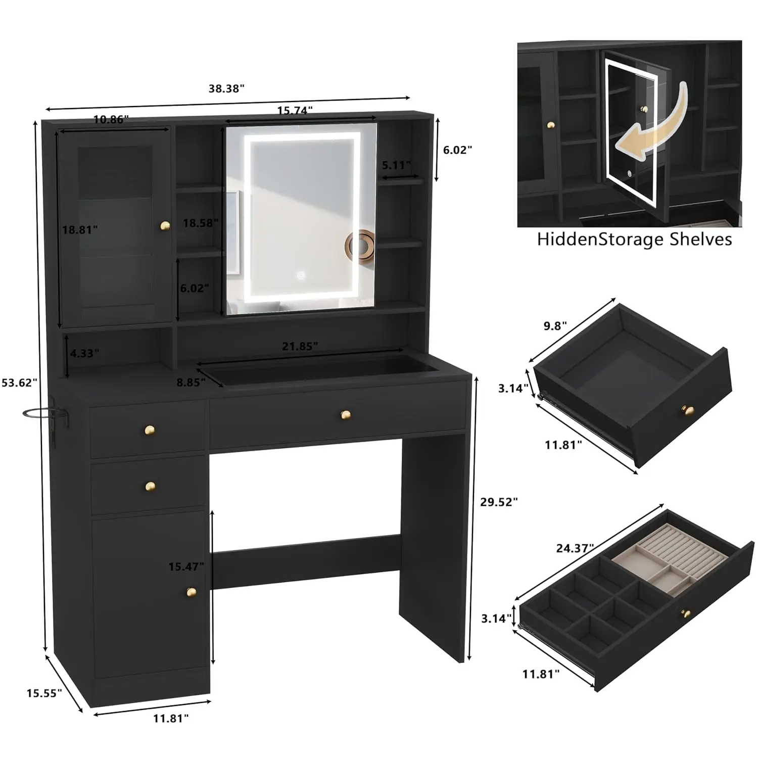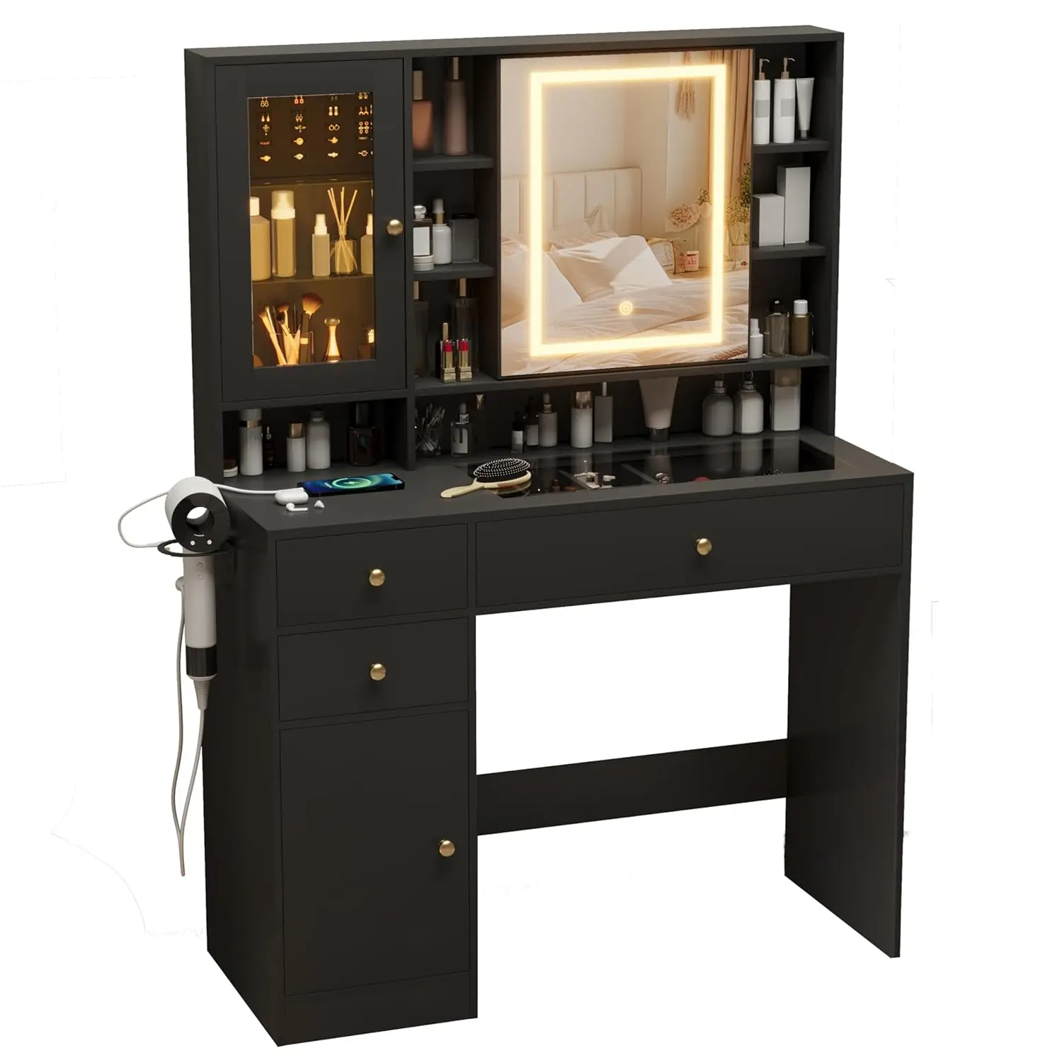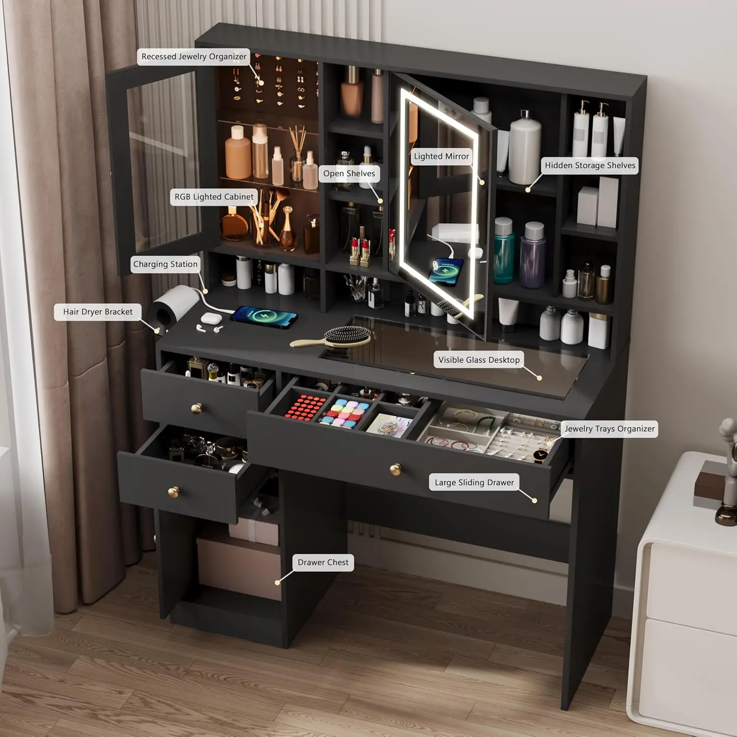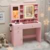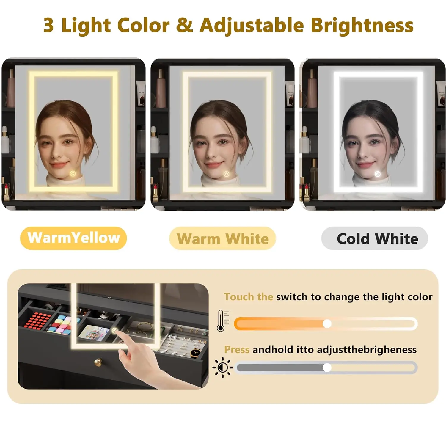 【Smart Storage for Makeup & Accessories】Featuring 3 drawers, 2 cabinets, and open shelving, this vanity provides ample space for all your beauty essentials. The large drawer includes a 9-grid organizer, while a jewelry tray keeps your rings, bracelets, and earrings neatly arranged