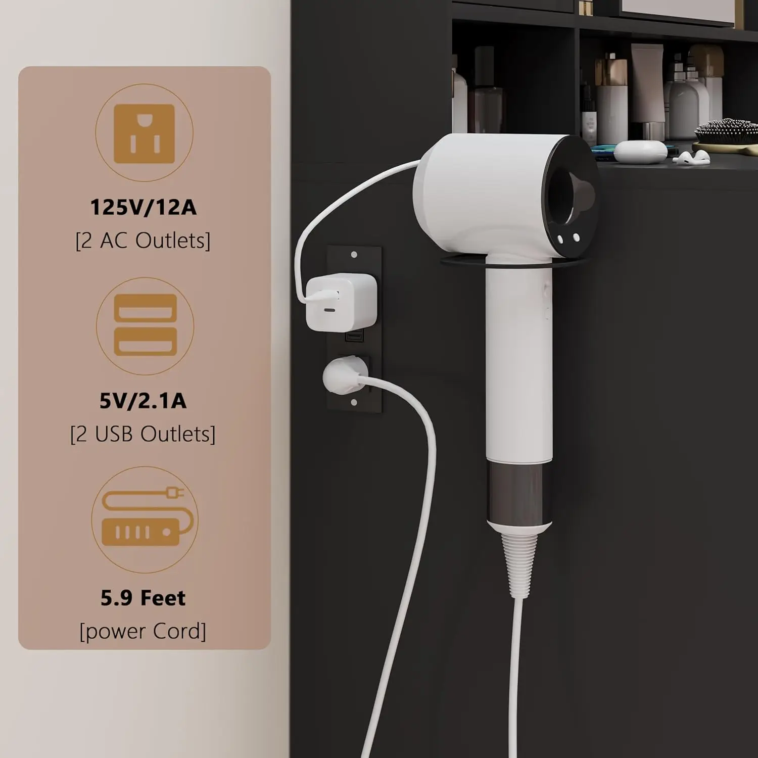 【Built-In Charging Station & Hair Dryer Holder】Equipped with 2 AC outlets and 2 USB ports, this vanity desk lets you conveniently charge your devices or power hair tools while getting ready. The built-in hair dryer rack adds extra convenience and organization