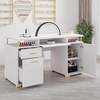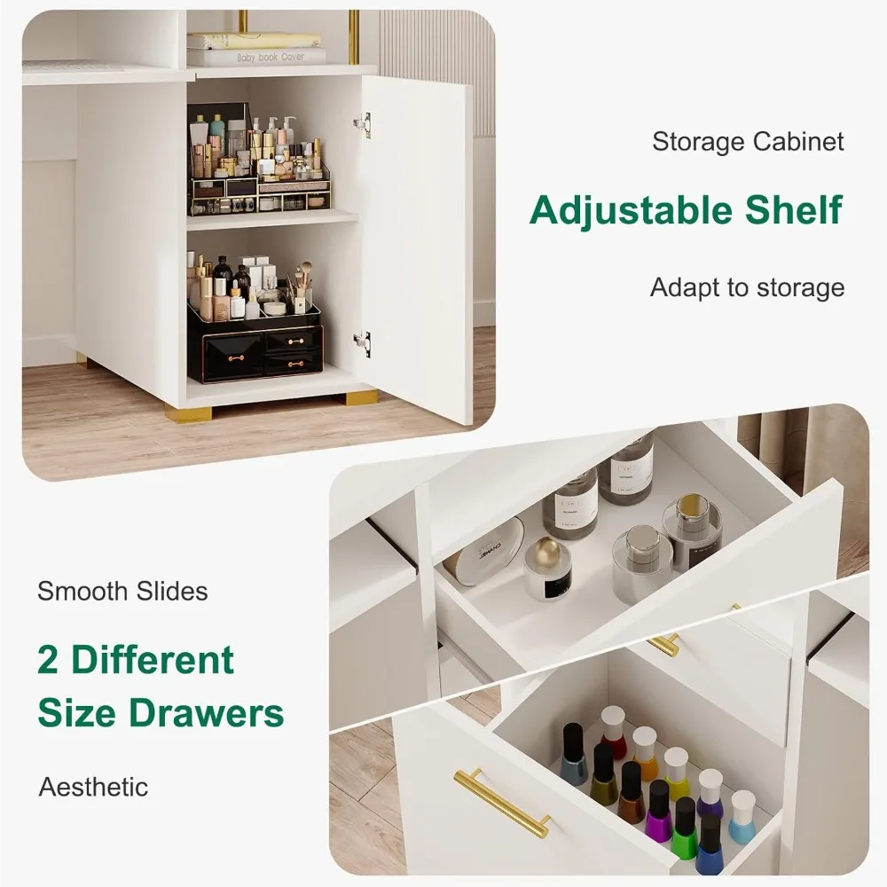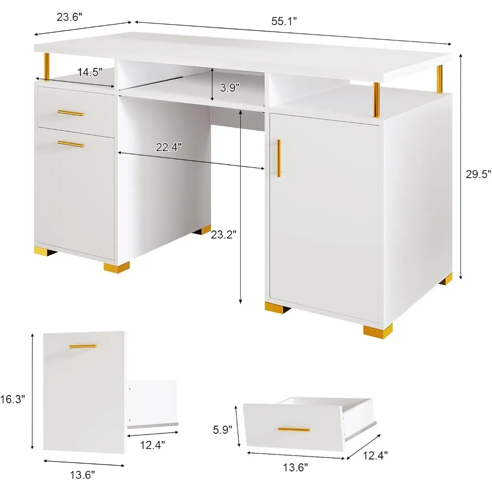 This nail technician desk features a spacious 55-inch tabletop, providing generous work area along with seven different storage solutions, including two open shelves, two enclosed cabinets, a movable shelf, a drawer, and a file cabinet, all designed to cater to various organizational needs. The desk is crafted with a pristine white finish and elegantly decorated with gold accents such as door handles, table legs, and support columns, creating a sophisticated and luxurious appearance that adds elegance and charm to your workspace. Beyond being a nail tech workstation, this manicure table is also versatile enough to serve as a study desk for students or a sturdy computer desk for various tasks. Made with premium materials and robust construction, this desk is built to last, featuring high-quality wood, reinforced legs, and sturdy support columns, with each component thoroughly inspected to ensure a solid and stable structure. Assembly is made easy with comprehensive packaging that includes all necessary parts, helpful assembly tools, and clear instructions, and our customer service team is always available to assist you, ensuring your satisfaction and convenience throughout the process.