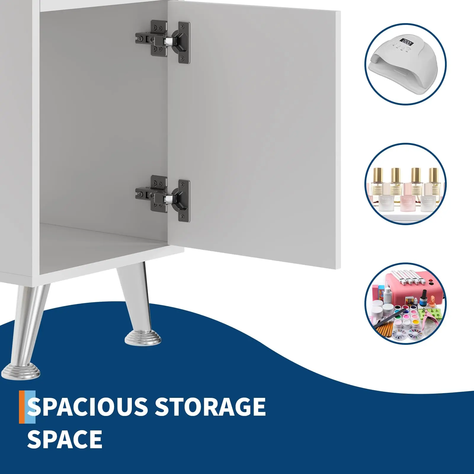 【Durable and Easy-to-Clean Nail Table】- Built for daily use, the nail desk for nail tech boasts a MDF tabletop that is waterproof, scratch-resistant, and simple to maintain. The stainless steel legs provide added stability, making it a durable choice for busy salons or home studios.