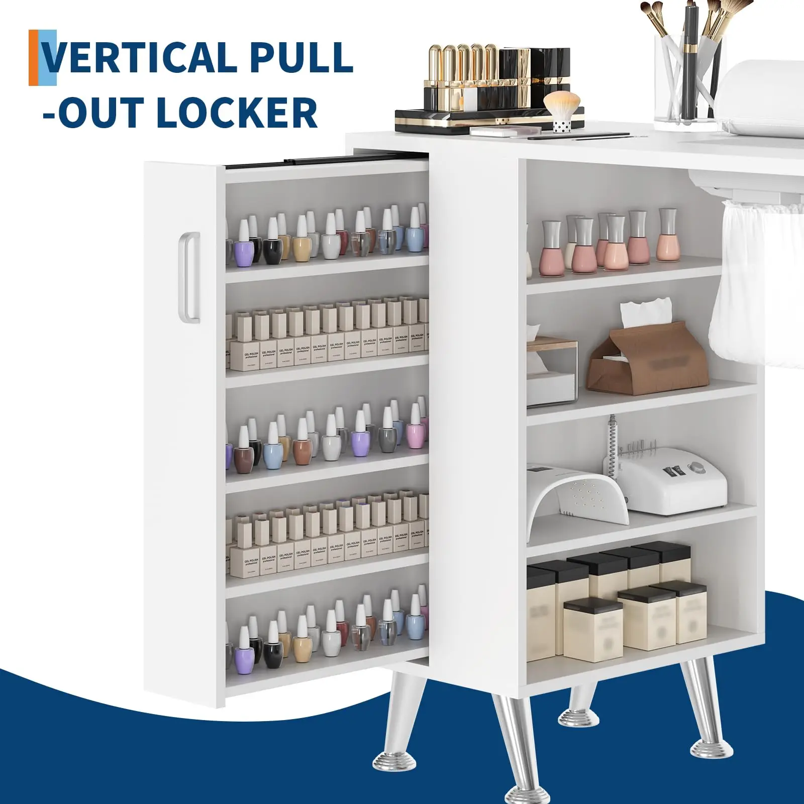 【Ample and Organized Storage for Nail Supplies】- The nail table for nail tech features 2 drawers with customizable dividers, 4 open shelves, 1 vertical pull-out locker, and a large side cabinet. This smart storage system ensures all your tools, polishes, and accessories are neatly organized and easily accessible.