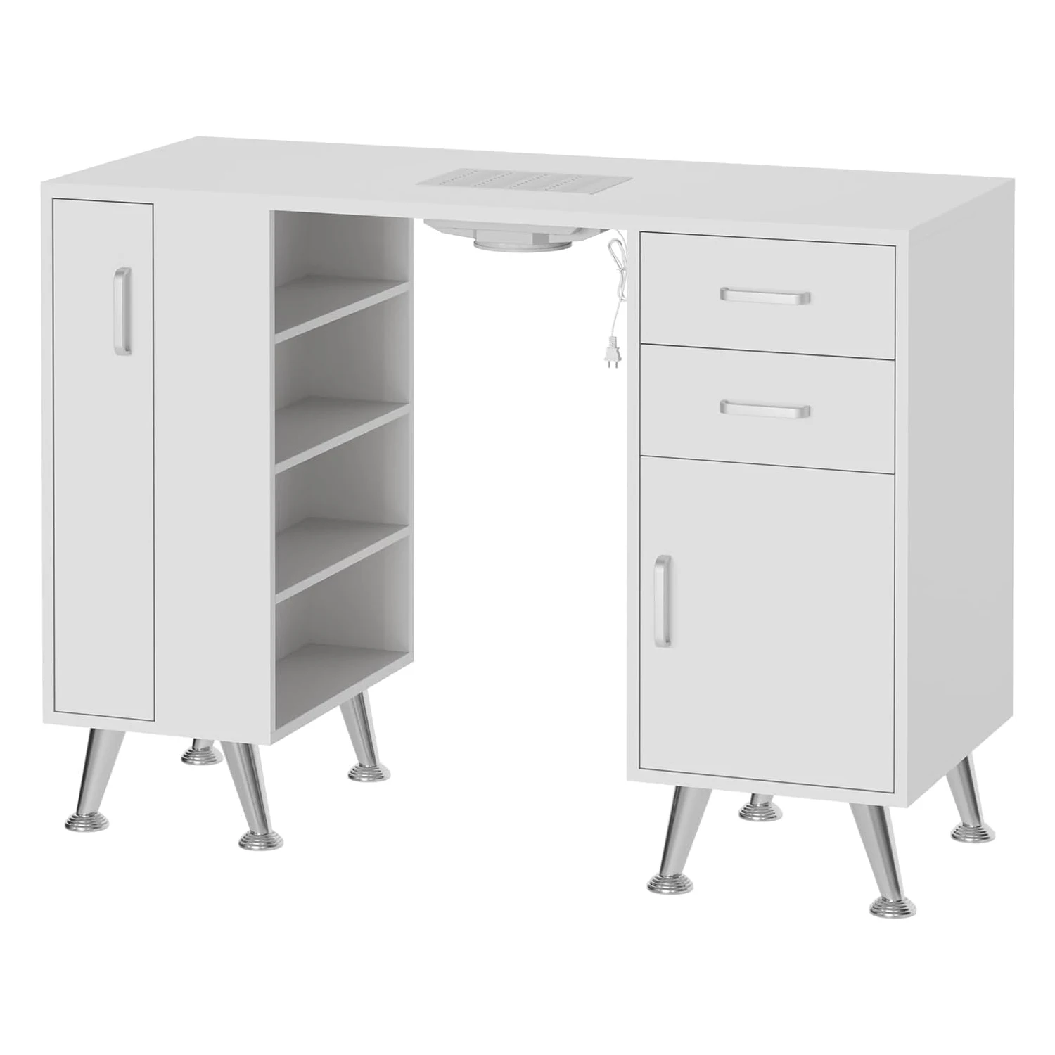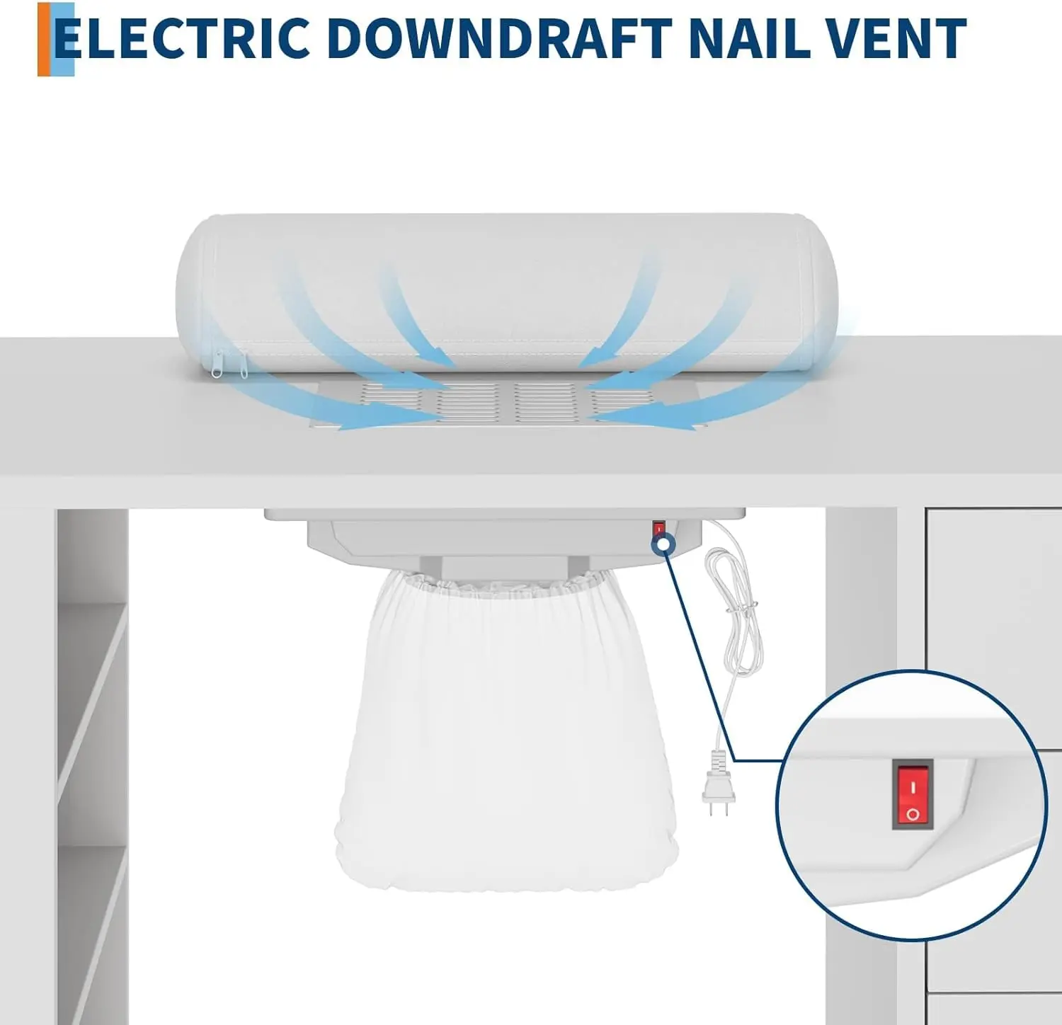 [Built-In Dust Collector With Filters] : The Manicure Table features an electric downdraft vent system that effectively collects dust, ensuring a clean environment, and includes two easy-to-empty reusable dust bags.