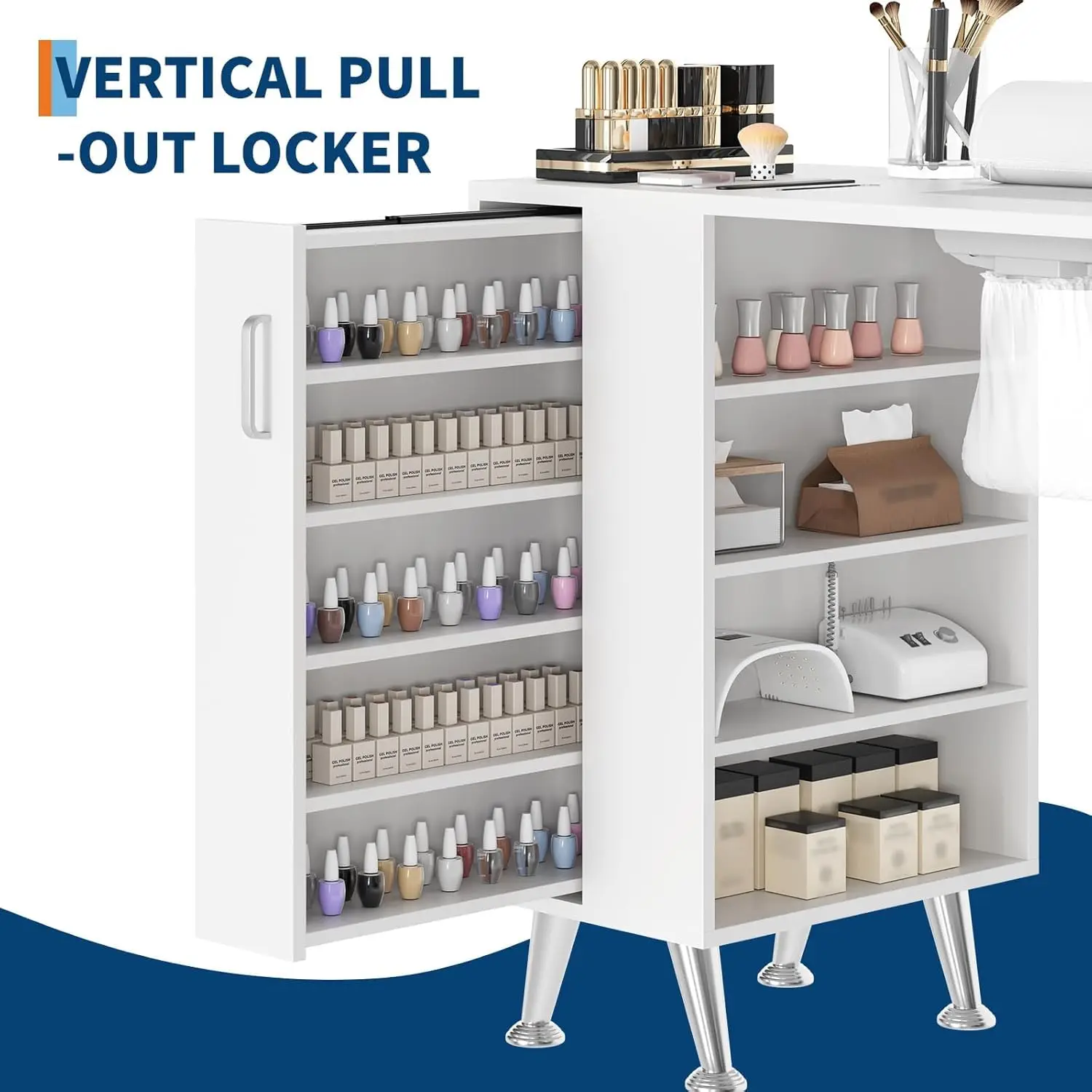 [Ample Storage Space]: This Nail Desk includes four open shelves, a vertical pull-out locker, two drawers, and a large-capacity side cabinet for ample storage, keeping your nail supplies and tools organized and easily accessible.