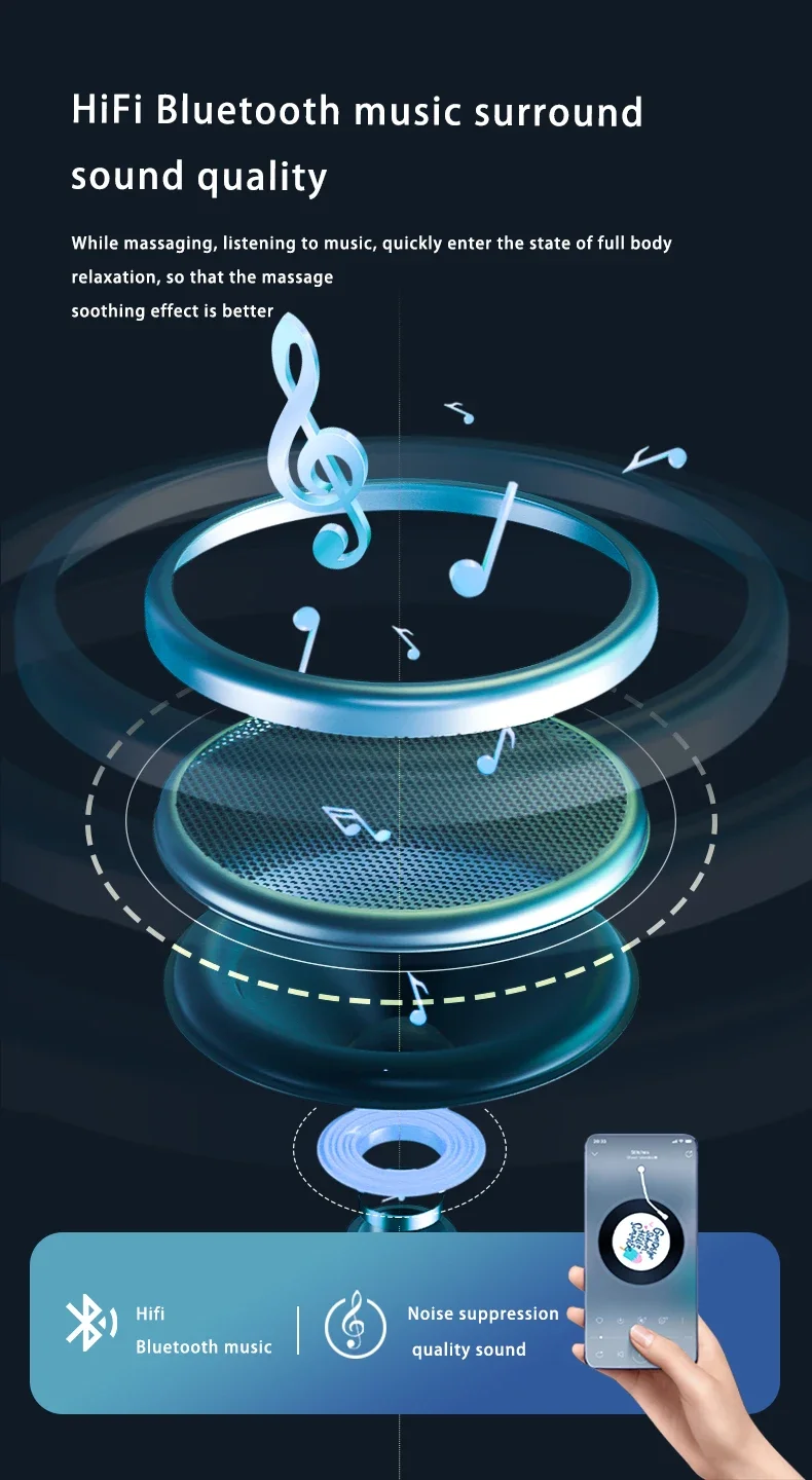 21. Extended massage trajectory 22. Neck eight finger technique 23. PE integrated molding 24. Stereo Bluetooth speaker