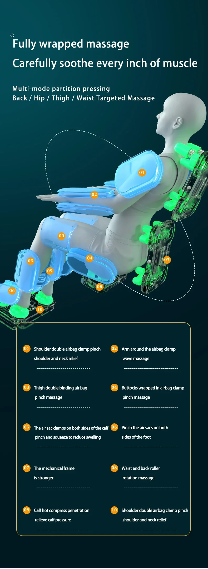 1. AI voice intelligent voice control 2. Zero gravity mode 3. Full body massage 4. Thigh airbag pinch