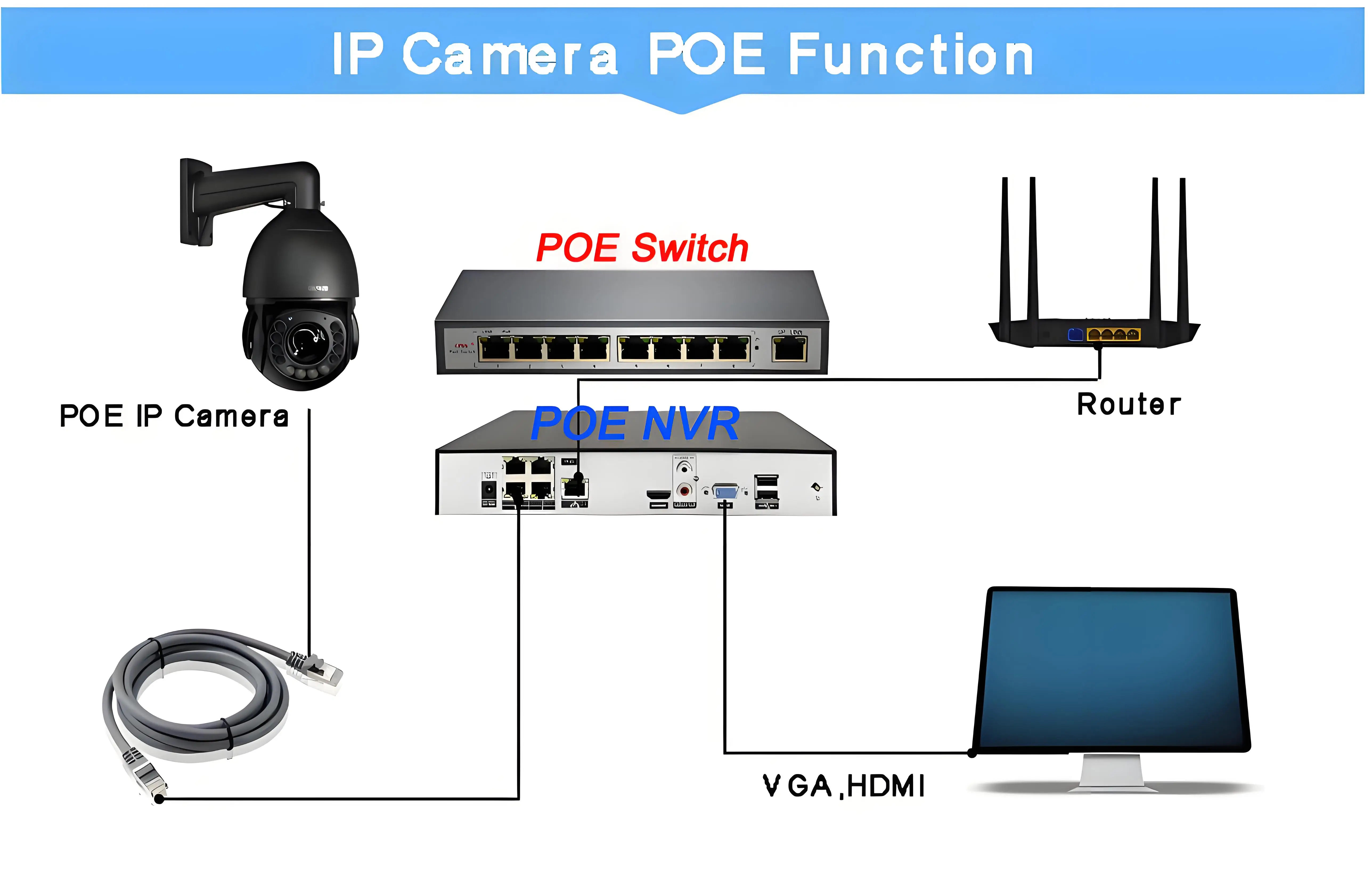 This Camera is POE PTZ Camera ,it can powered by 12V Power adapter,POE Switch,Poe injector or POE NVR.it can be controlled by phone(APP),PC(Web Browser,PC Software) and DVR NVR.