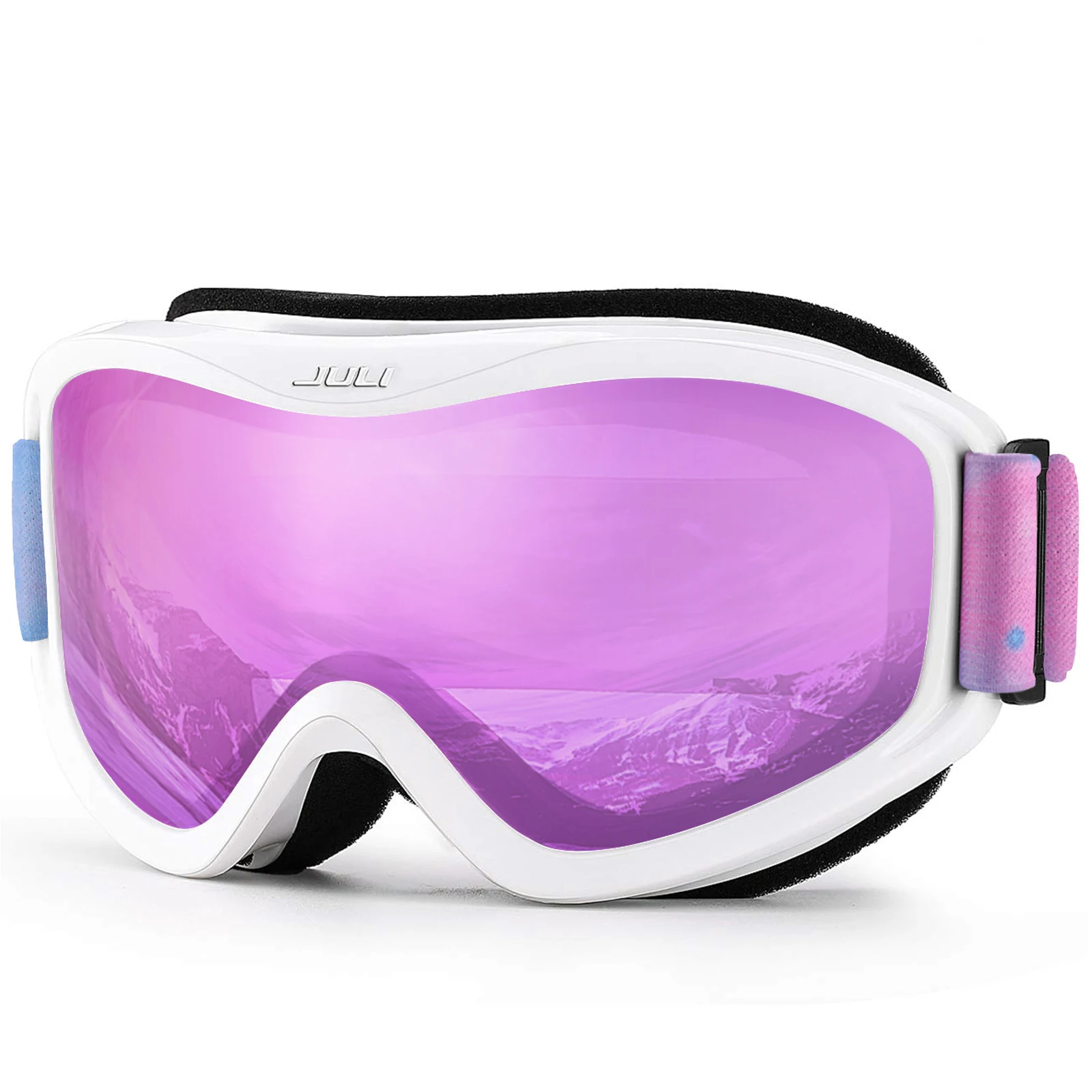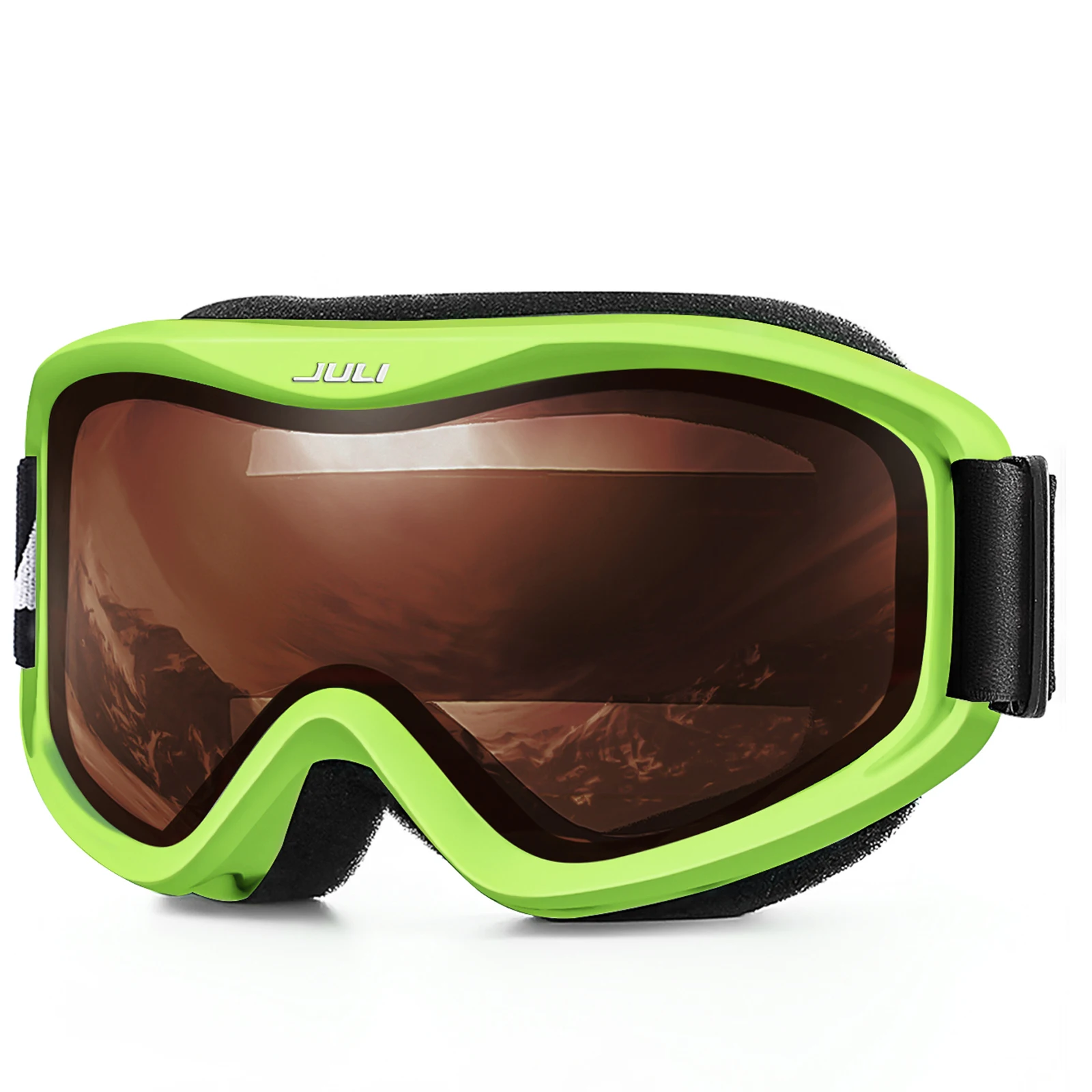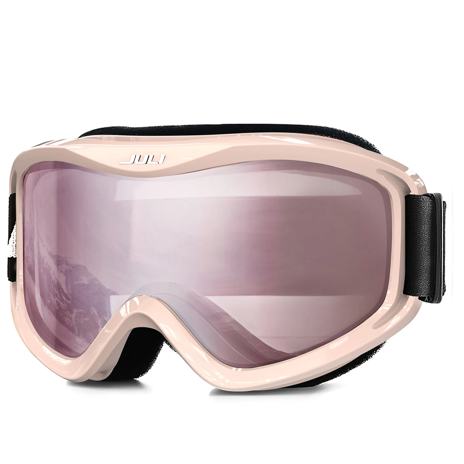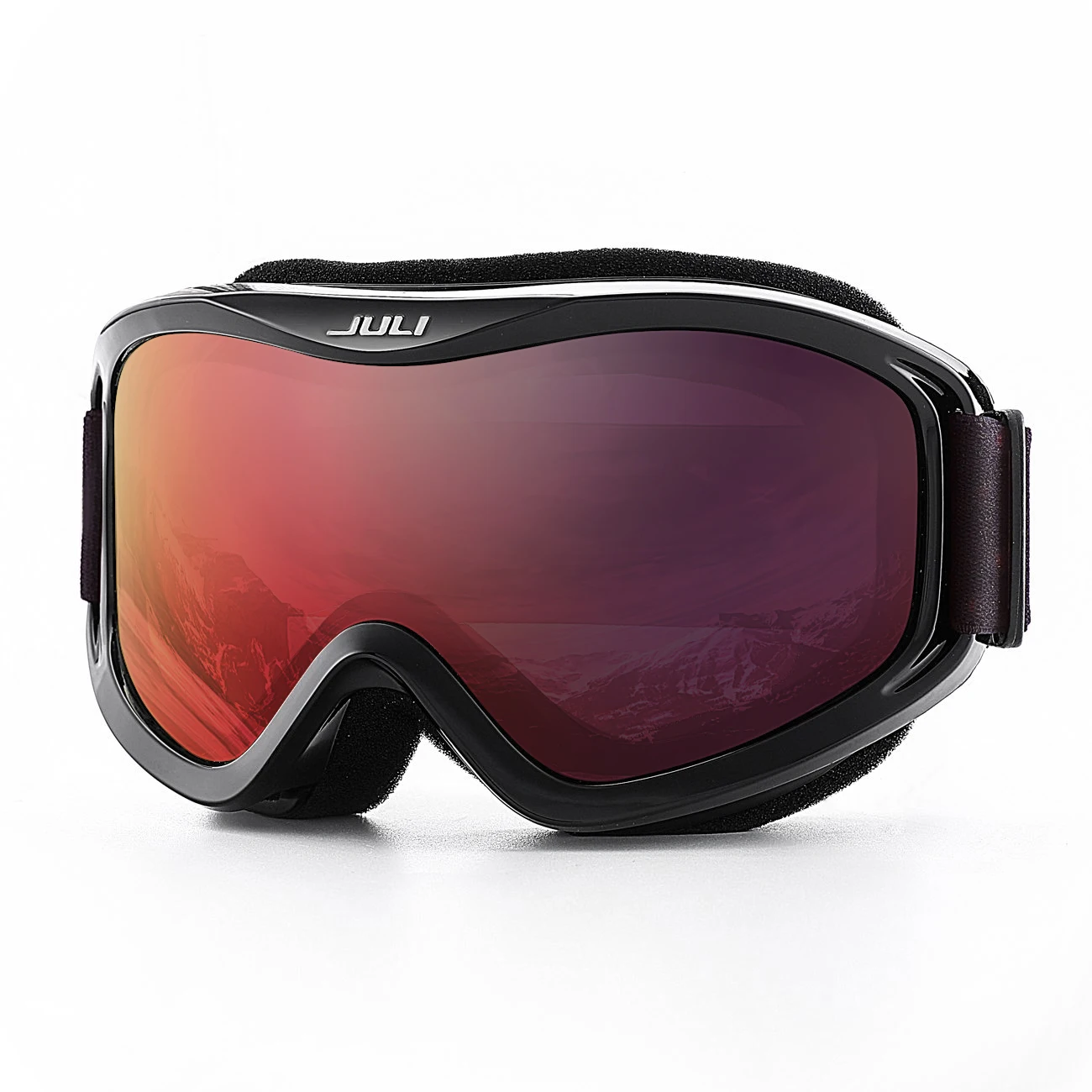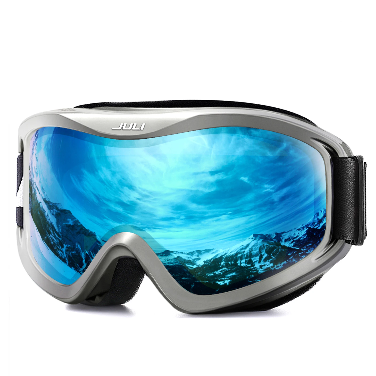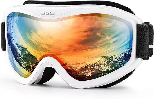 The JULI ski goggles featured with double lens made of solid PC material which came with unique material anti-fogging treatment and 100% UV400 protection that cuts the glare.