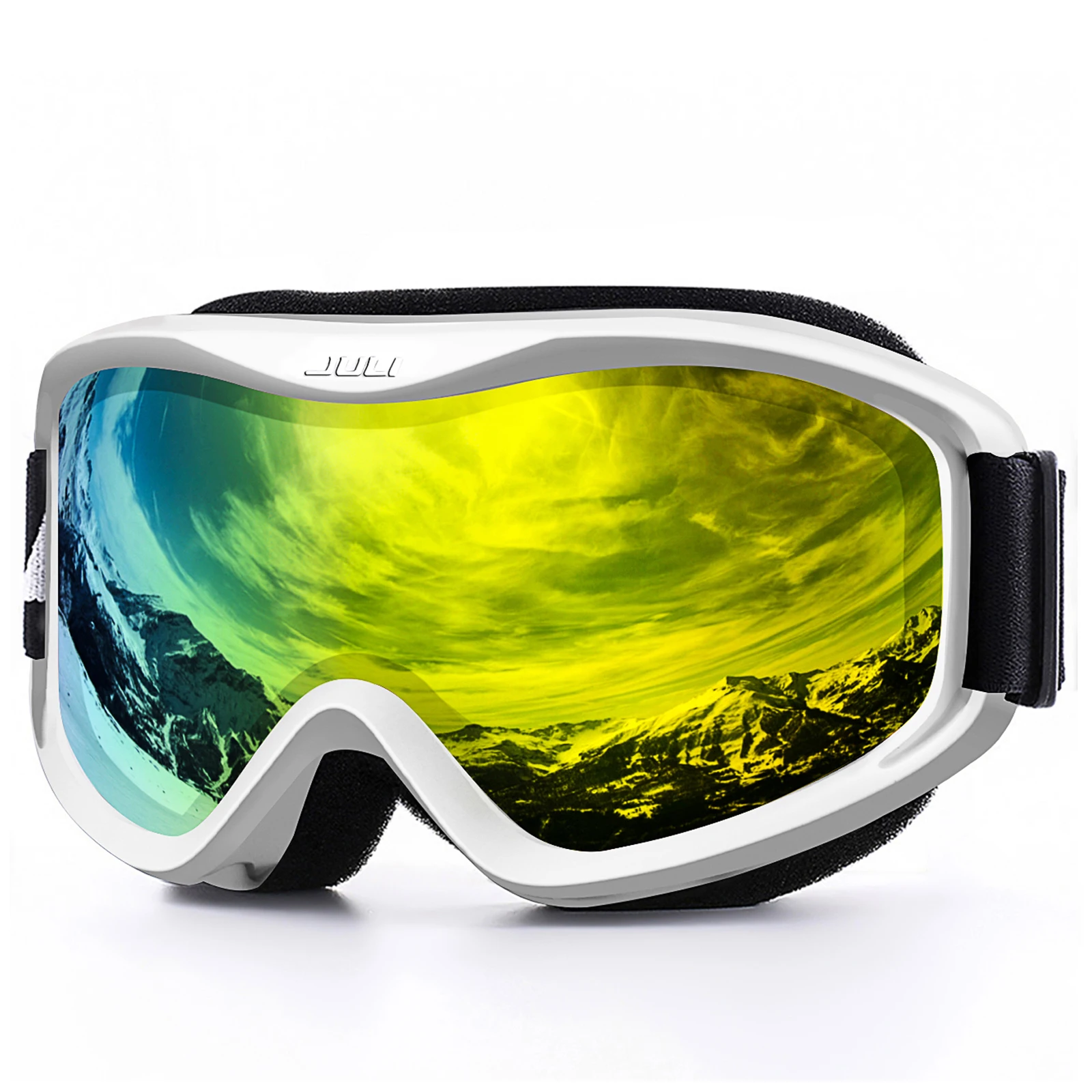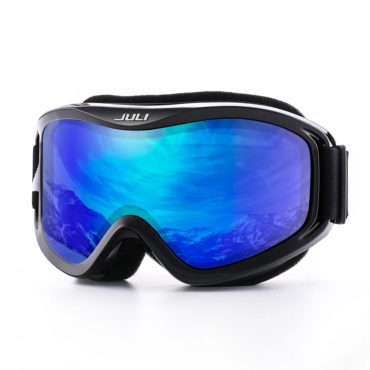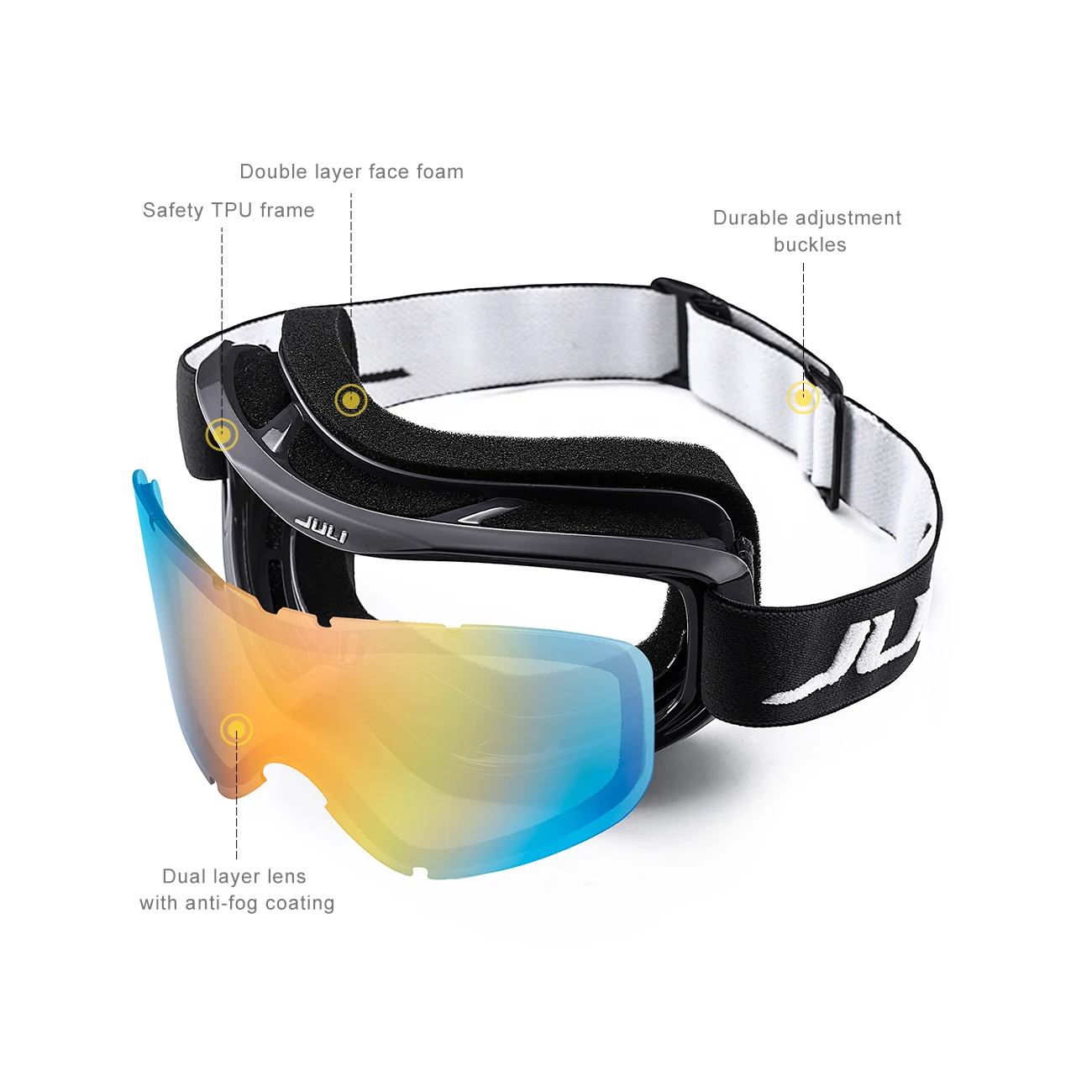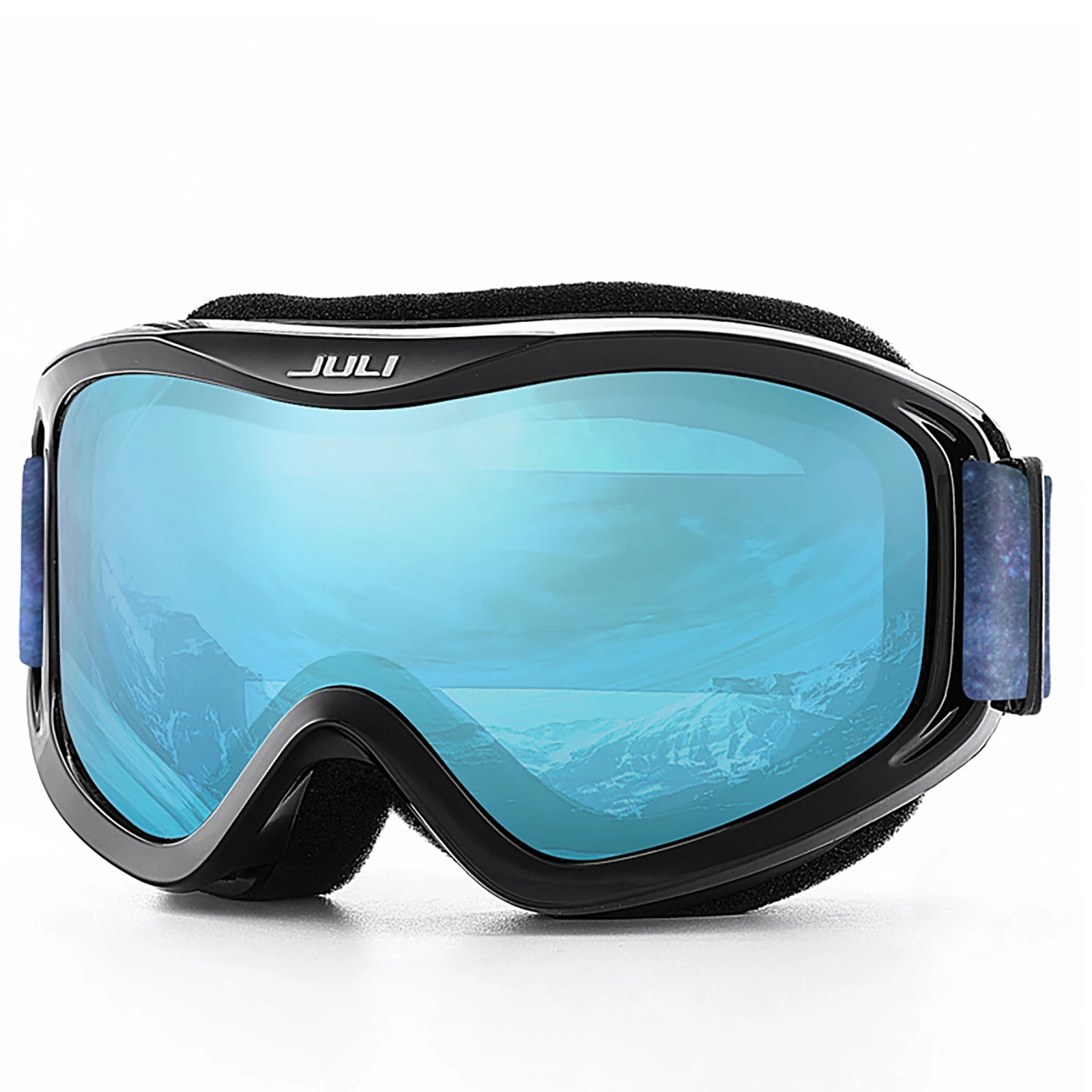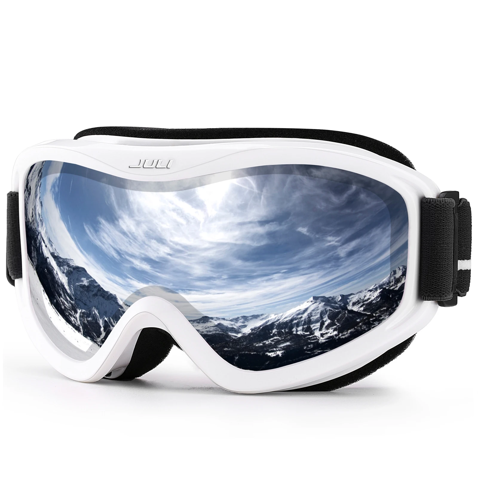 The JULI ski goggles featured with double lens made of solid PC material which came with unique material anti-fogging treatment and 100% UV400 protection that cuts the glare.