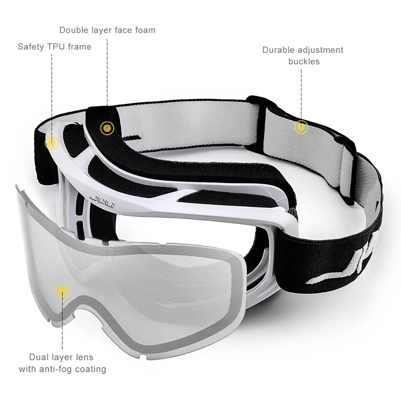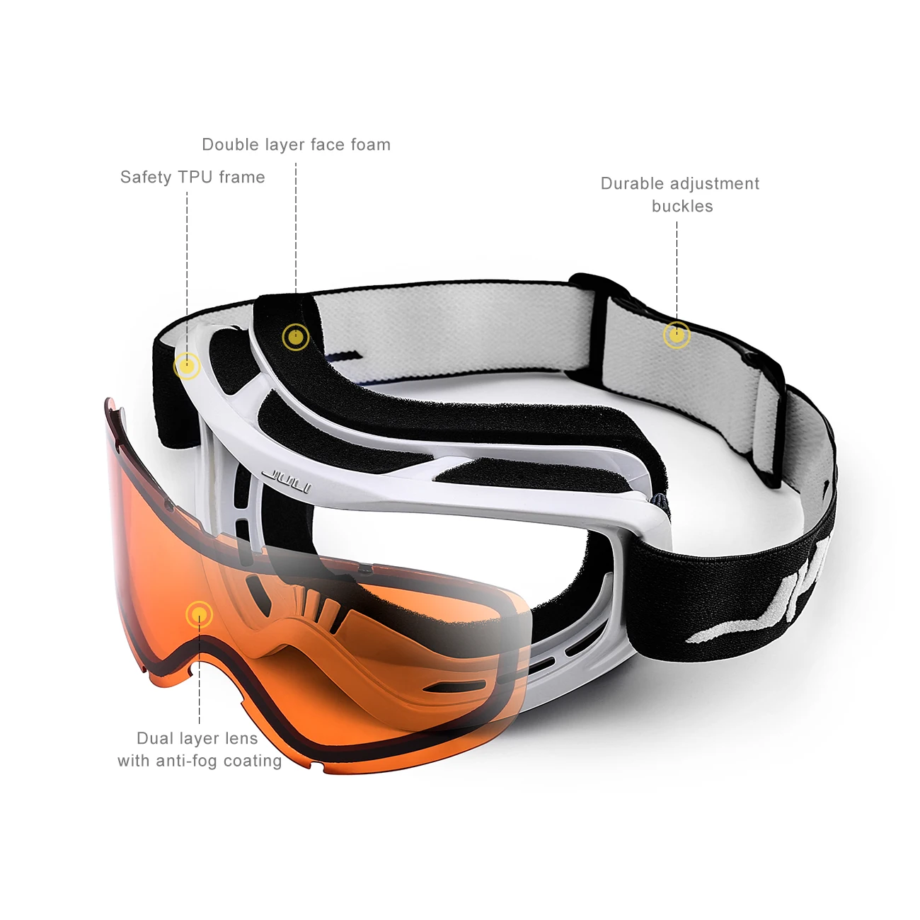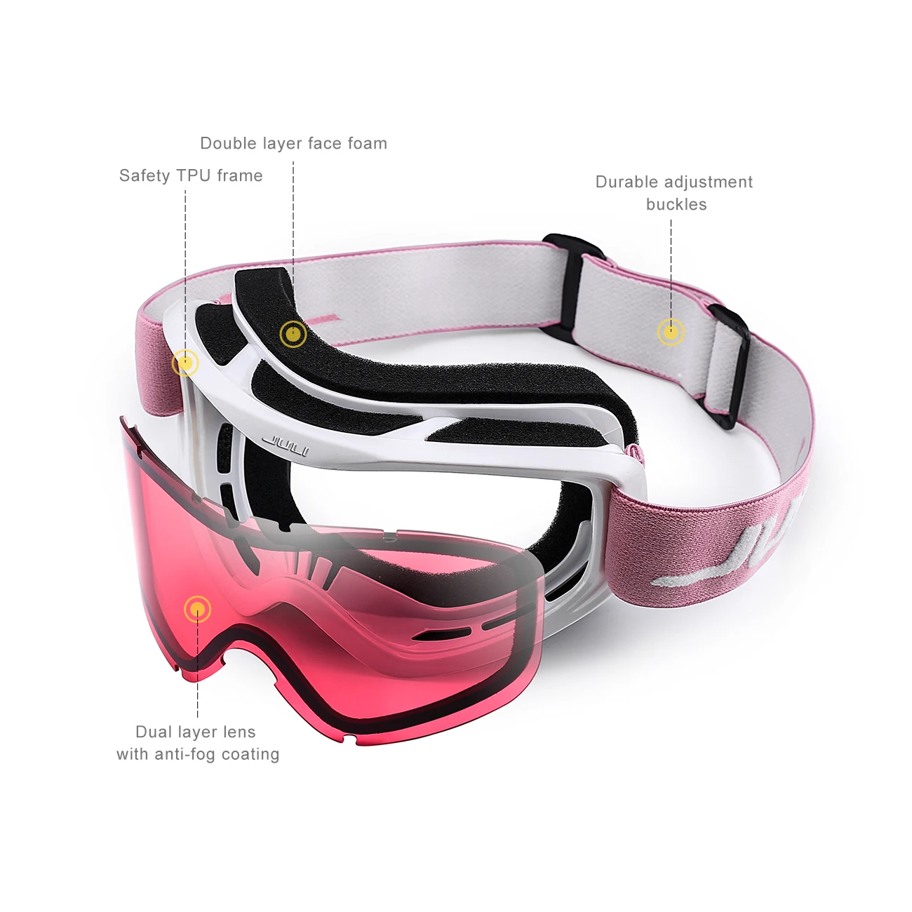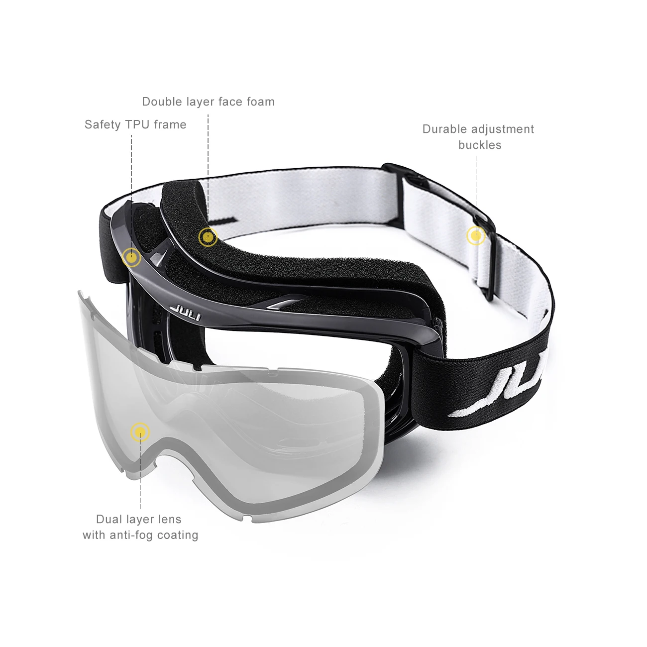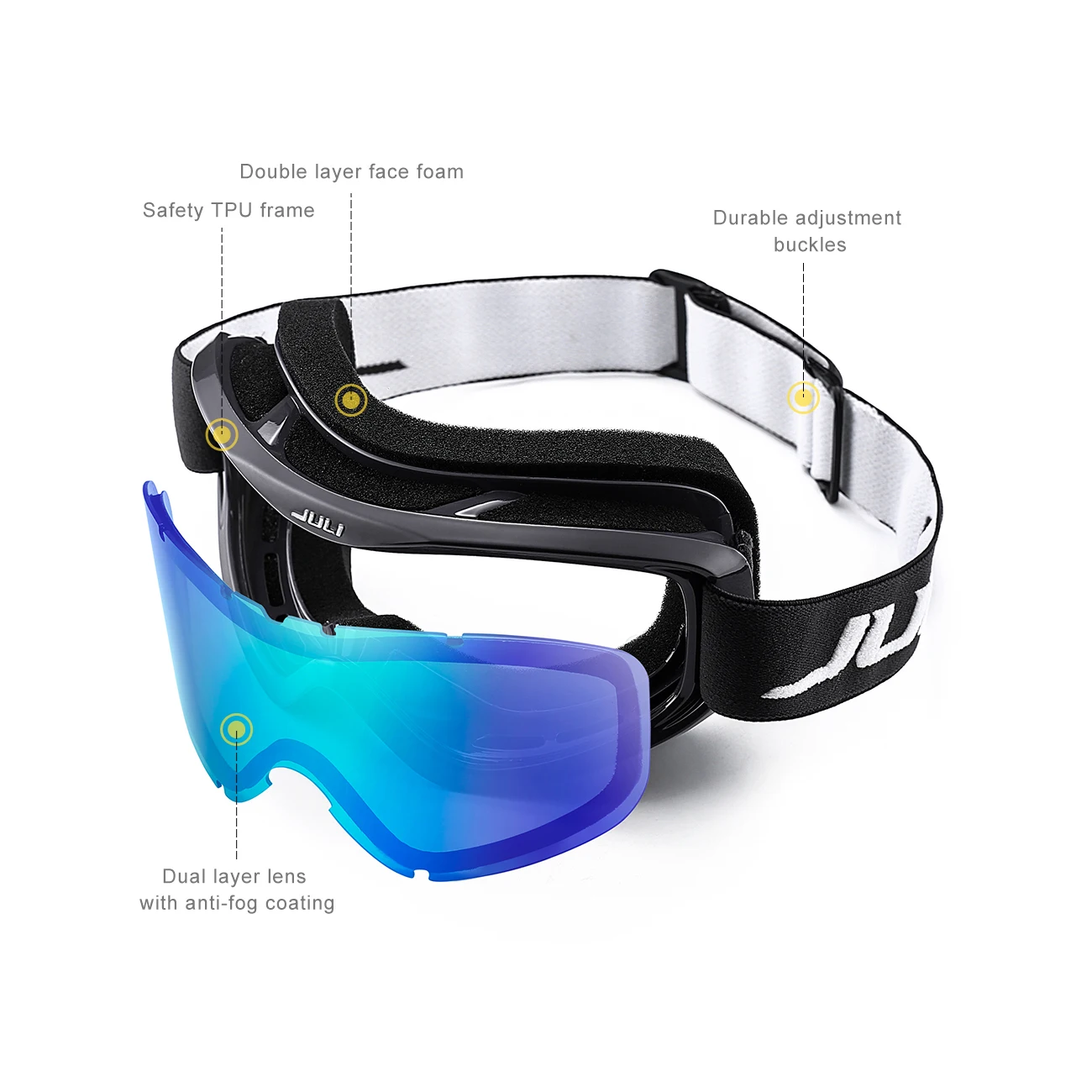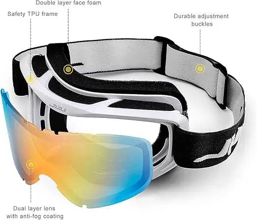 The JULI ski goggles featured with double lens made of solid PC material which came with unique material anti-fogging treatment and 100% UV400 protection that cuts the glare.