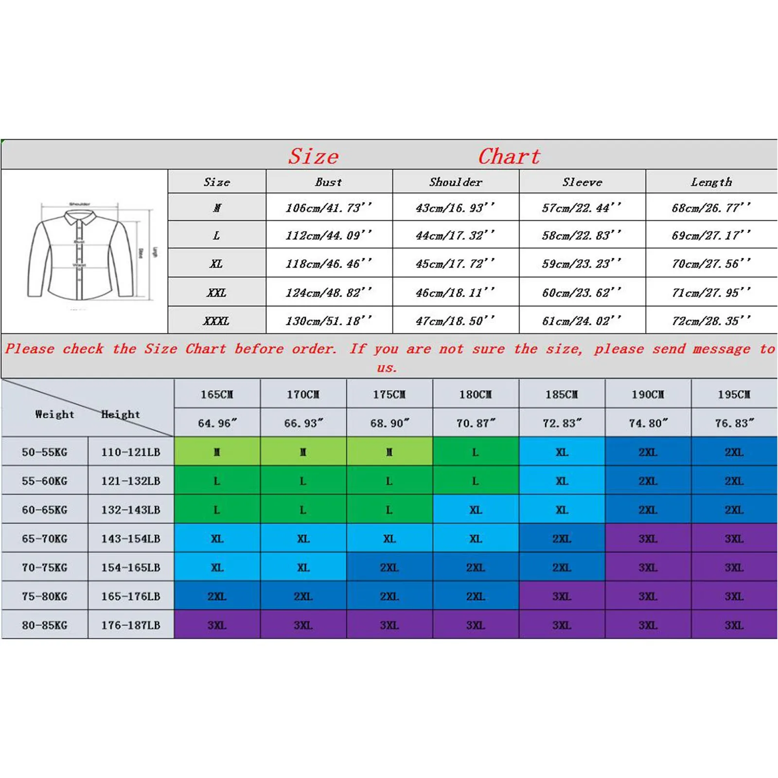 | Size:XXXL | Bust:130cm/51.18” | Shoulder:47cm/18.50” | Sleeve:61cm/24.02” | Length:72cm/28.35” |