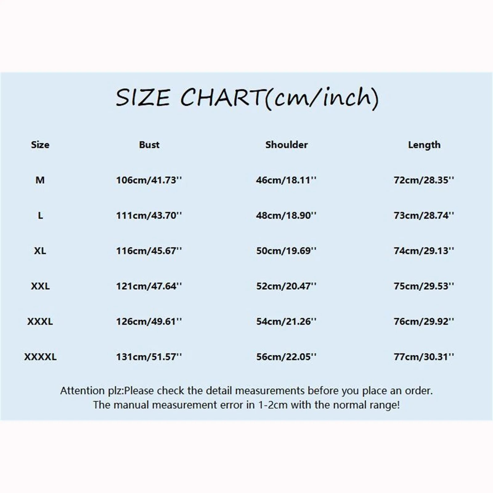 | Size:XXXXL | Bust:131cm/51.57” | Shoulder:56cm/22.05” | Length:77cm/30.31” |