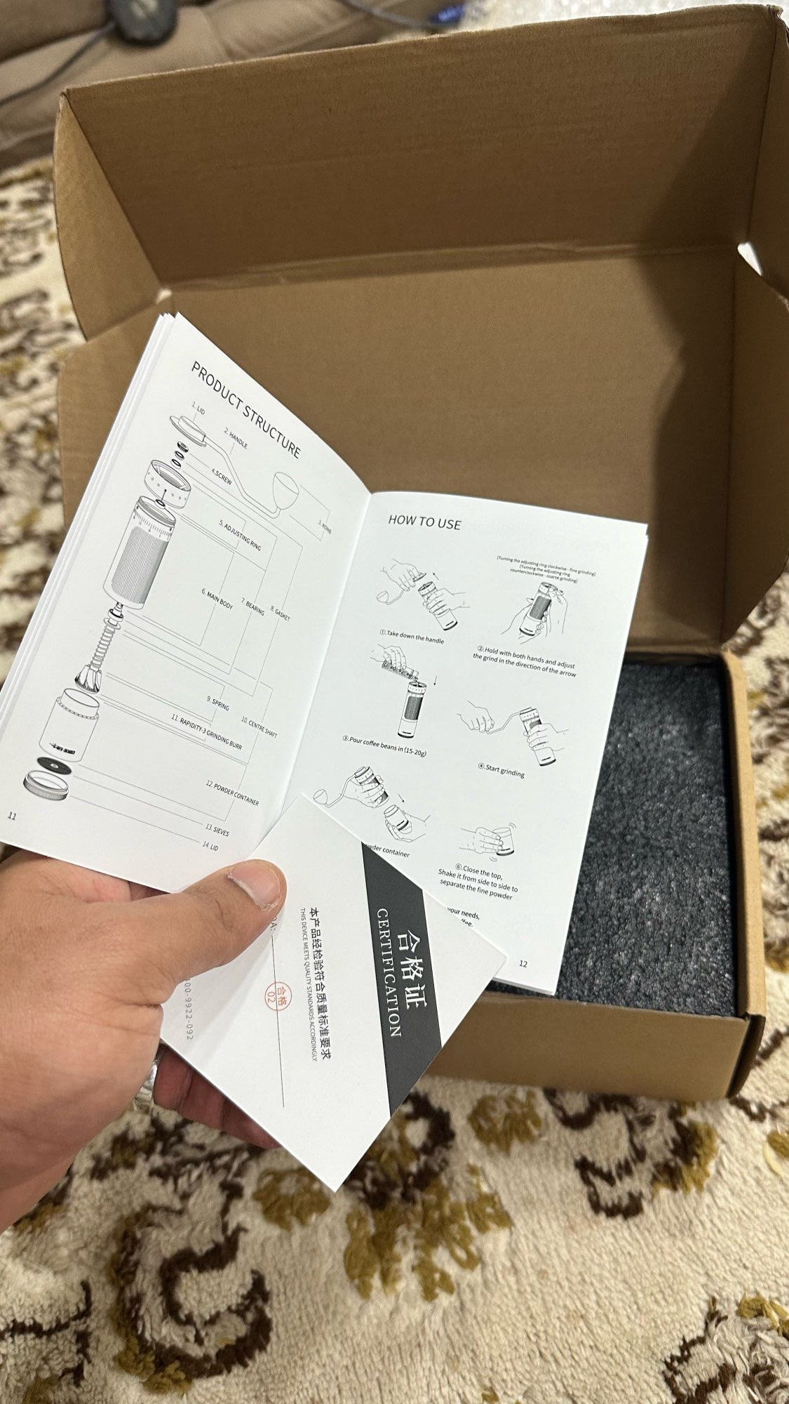 Arrived on time, in a cardboard box. Item was very well packaged, nothing can move or fall out from the box, and the package can survive serious damages. I received 40 paper filters, i think it was a gift. The grinder is a massive, relatively heavy item. It is fully made from metal. The body and the bottompart is alu, and the inner components are iron/steel. The end of the handle is wood, i think chest or wallnut. I did not try out, i do not have the time. But sooner or later… I can recommend this item, if you woukd like to have a not so expensive manual coffee/spice grinder.